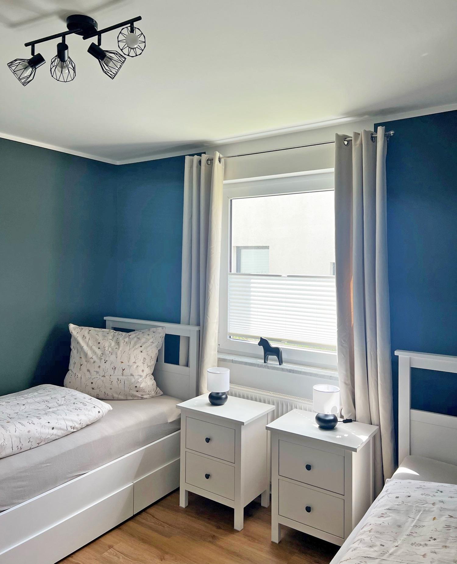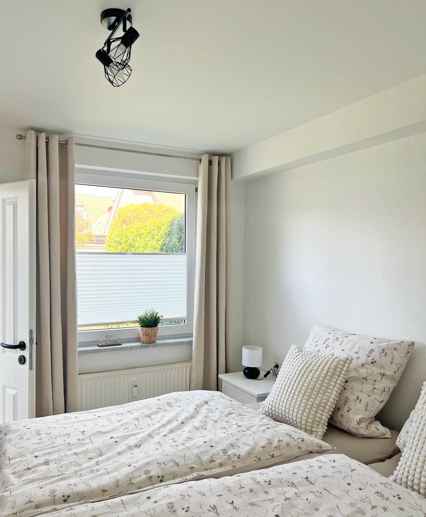 Das kleinere Schlafzimmer ist mit zwei Einzelbetten (1x 90x200cm), 2 Nachttischen, einem Stuhl und einem Kleiderschrank ausgestattet. Der Raum ist gefliest und lässt sich verdunkeln. Abgehend vom Wohnzimmer befindet sich das zweite Schlafzimmer, ausgestattet mit einem Doppelbett (2x 90x 200), einem geräumigen Kleiderschrank und zwei Nachttischen. Dieser Raum ist ebenfalls gefliest und verfügt über Verdunkelungsmöglichkeiten.
