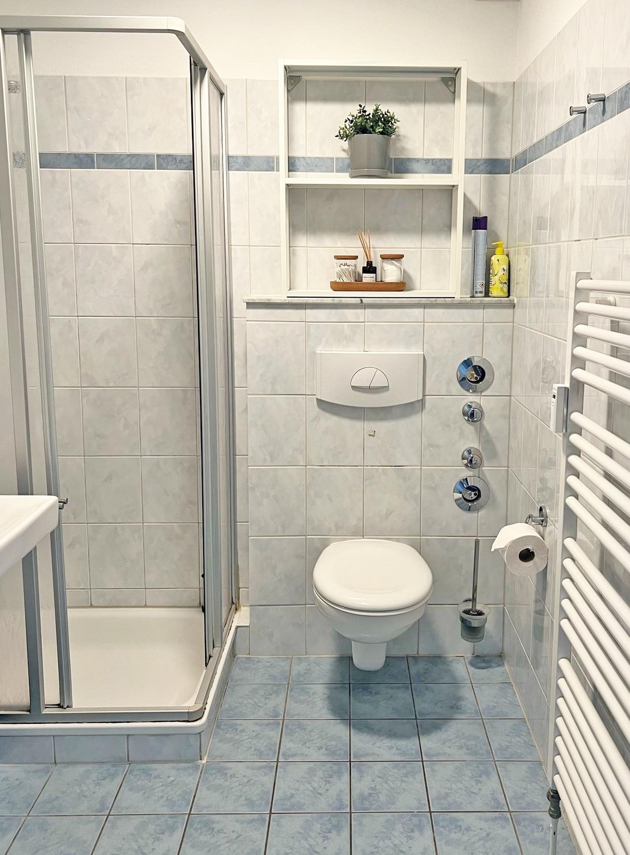 Hell gefliestes Badezimmer mit Dusche, Toilette und Waschbecken.