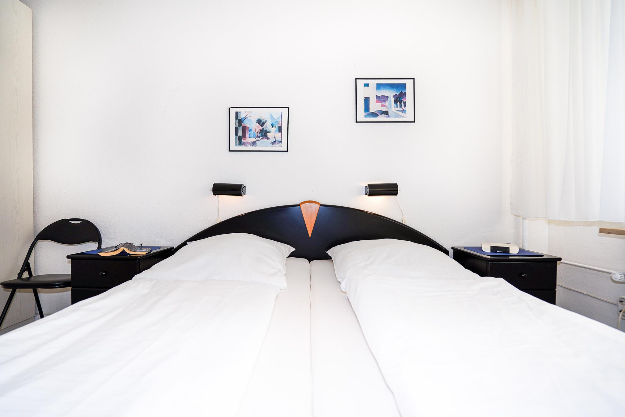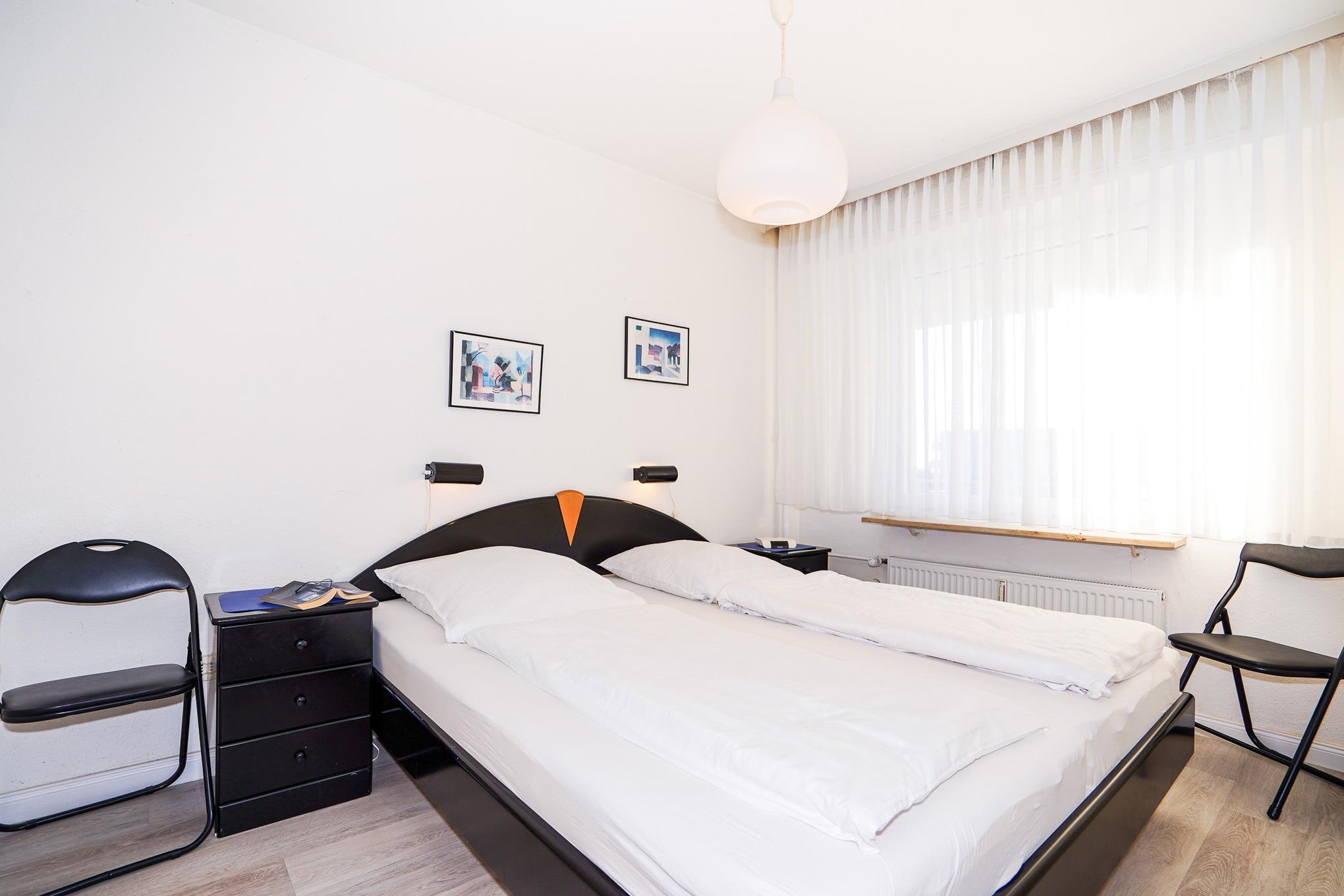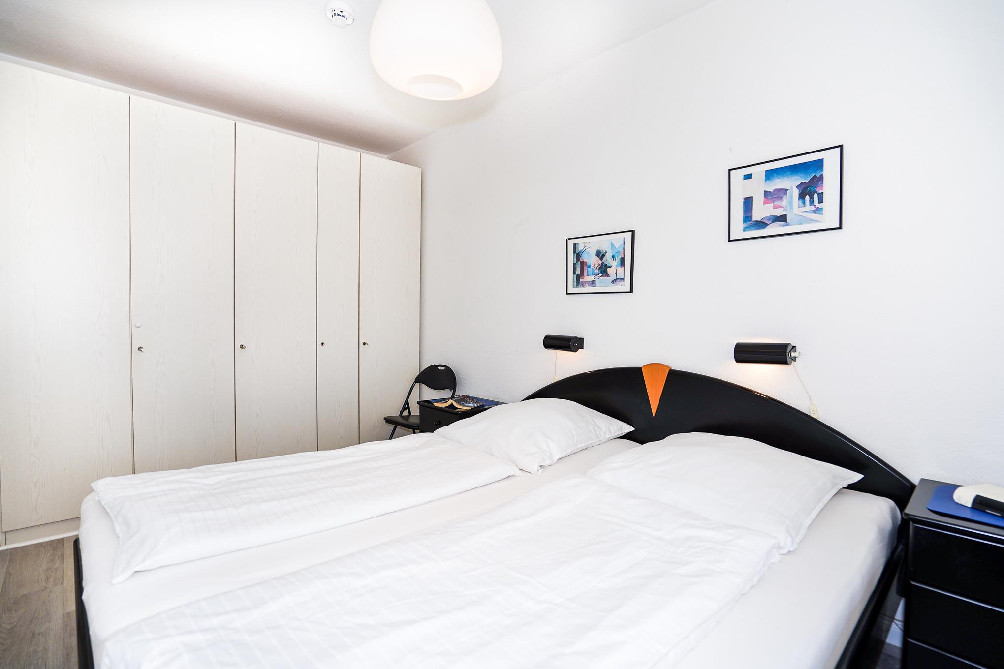 Das Schlafzimmer in Schwarz-Weiß Optik ist mit einem Doppelbett (180x200cm) und einem großen Kleiderschrank ausgestattet. Im Flur steht Ihnen ein großer Wandschrank zur Verfügung, so dass Sie ausreichend Stauraum vorfinden.