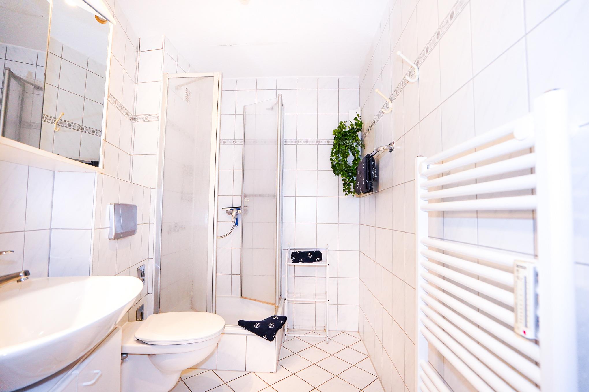 Das helle Badezimmer bietet Ihnen eine Dusche, WC und Waschbecken.