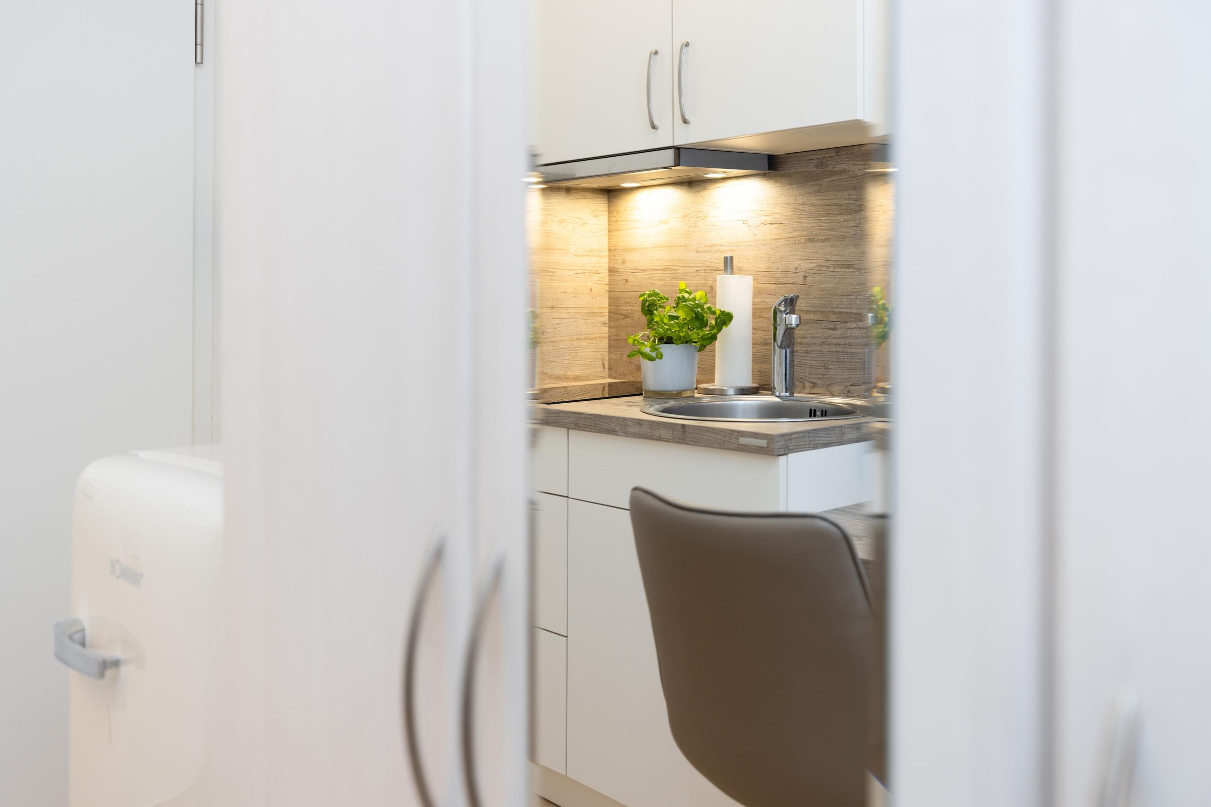 Auf 21 m² findest du alles was du brauchst in nur einem Raum: Wohnbereich, Schlafraum und Küchenzeile mit Essplatz.