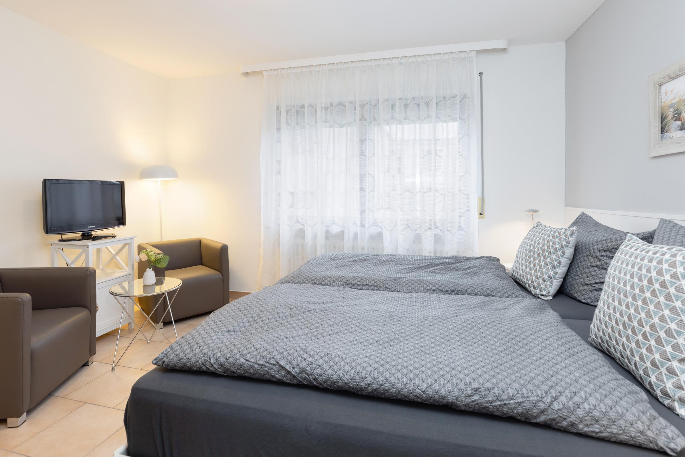 Schlafbereich mit Doppelbett (180x200 cm), Wohnbereich mit 2 Sesseln und kleinem Tisch, Essplatz und Küchenzeile sind ansprechend gestaltet.