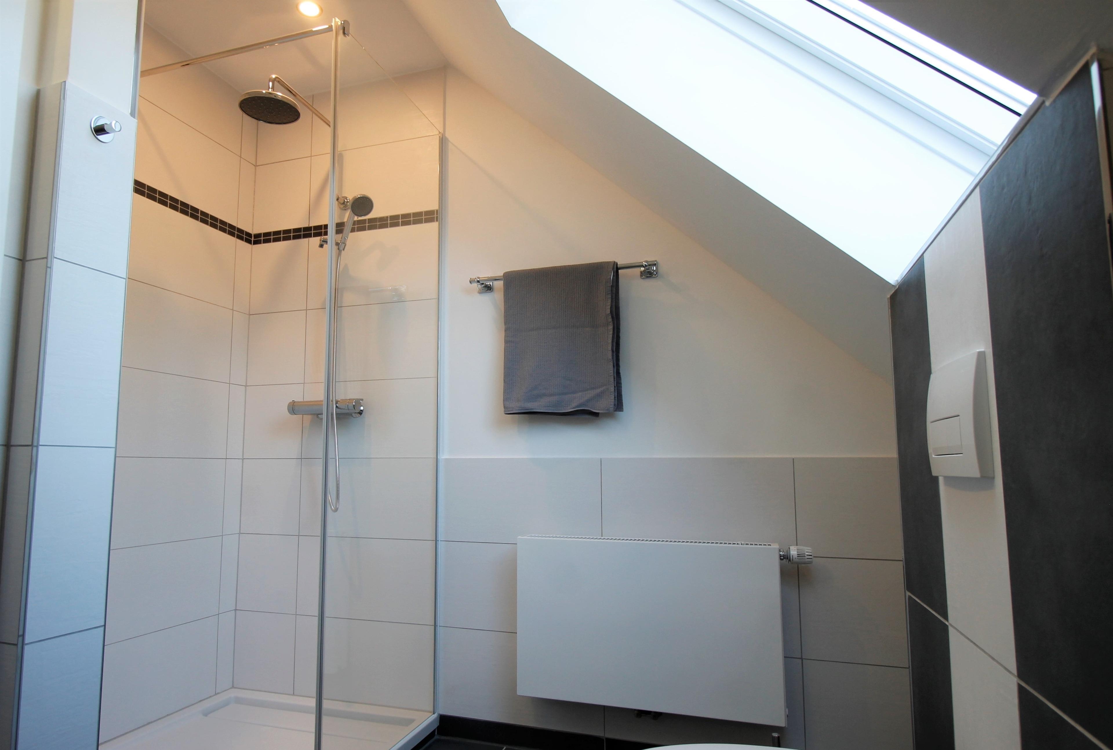 Das helle Duschbad mit Tageslicht hat eine bodengleiche Dusche mit Glaswand und Regendusche.