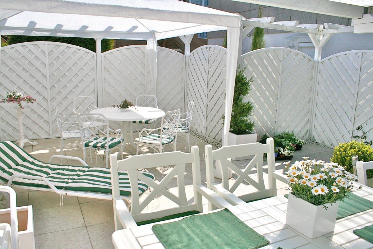 Genießen Sie sonnige Tage auf Ihrer Terrasse mit Gartenstühlen und Liegen oder entspannen Sie im Strandkorb direkt an Ihrer Unterkunft.