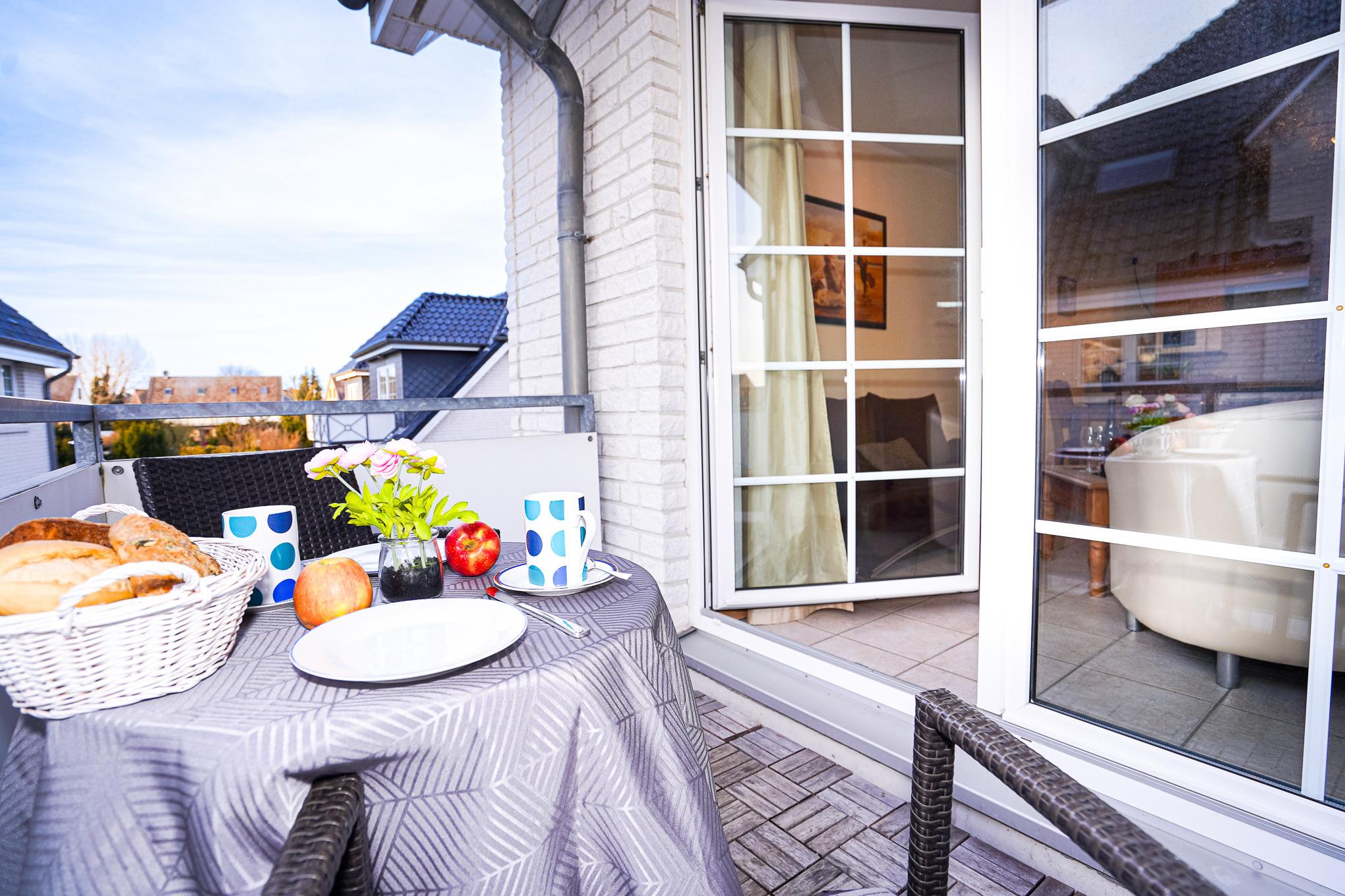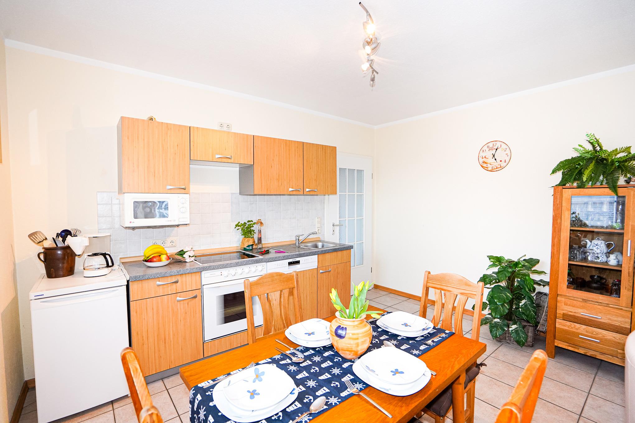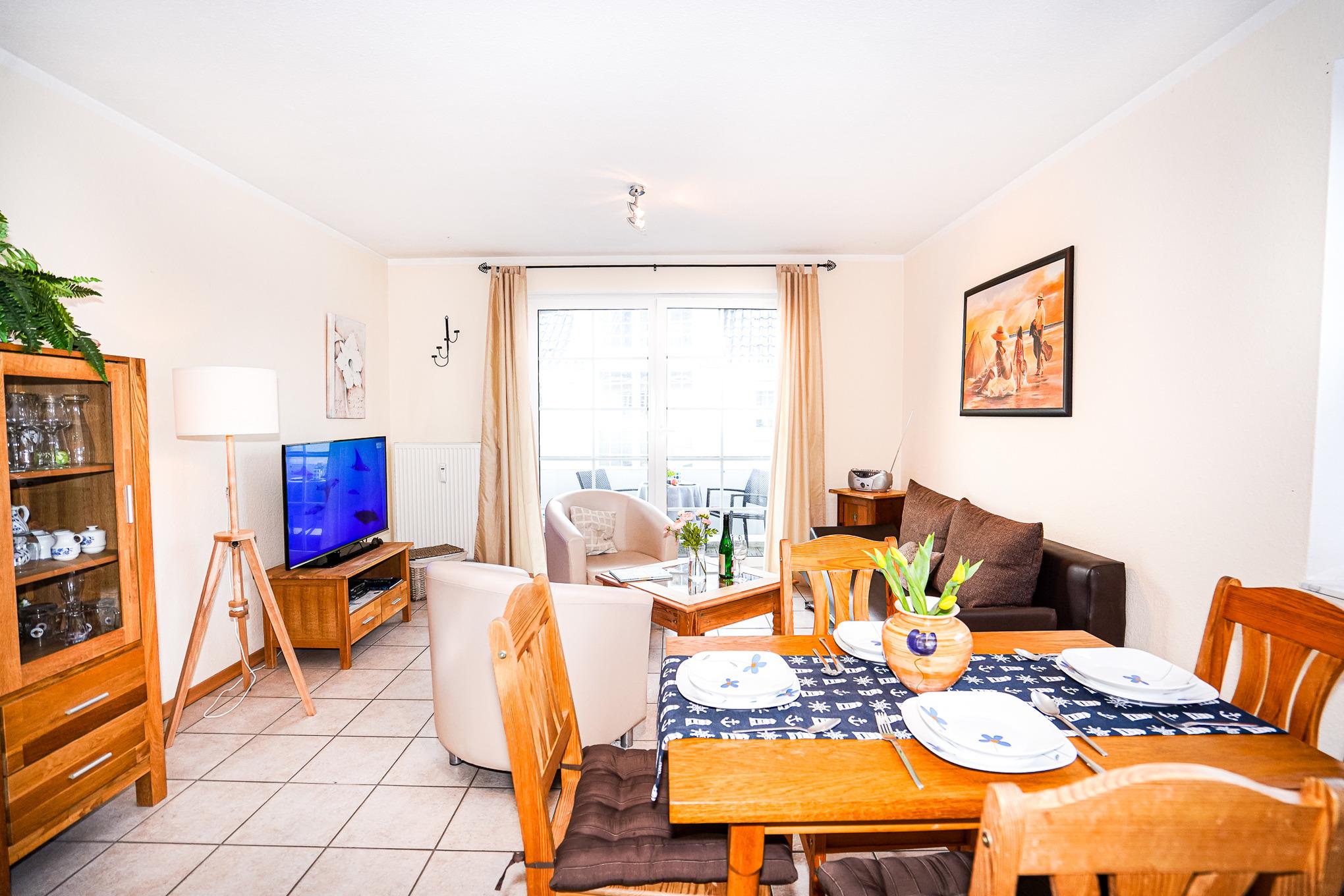 Der Wohnbereich ist mit einem bequemen Sofa, zwei Sesseln und einem Esstisch mit vier Stühlen ausgestattet. Die Küchenzeile verfügt über einen Backofen, Ceranfeld, Spülmaschine, Kühlschrank mit Gefrierfach, Mikrowelle und diverse Elektrokleingeräte. Von hier aus betreten Sie den Balkon in Süd-West-Ausrichtung. Entspannen Sie hier nach einem ausgiebigen Tag am Strand.