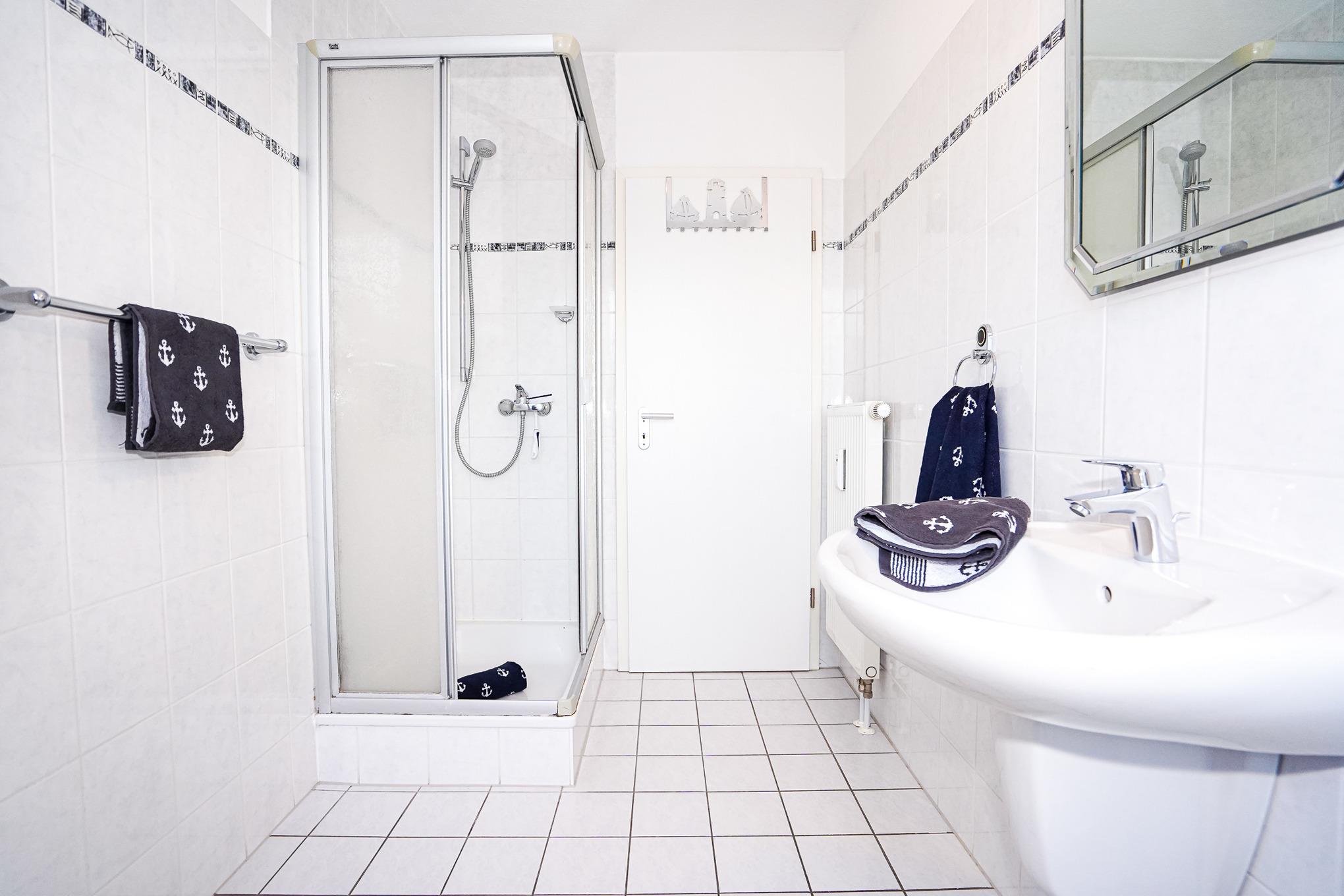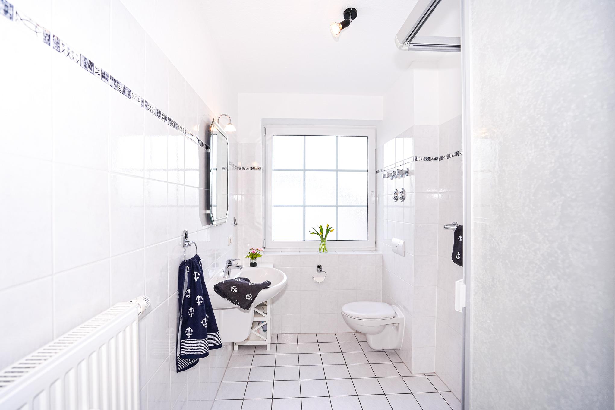Das sehr großzüge hell geflieste Tageslichtbadezimmer vefügt über eine Dusche.