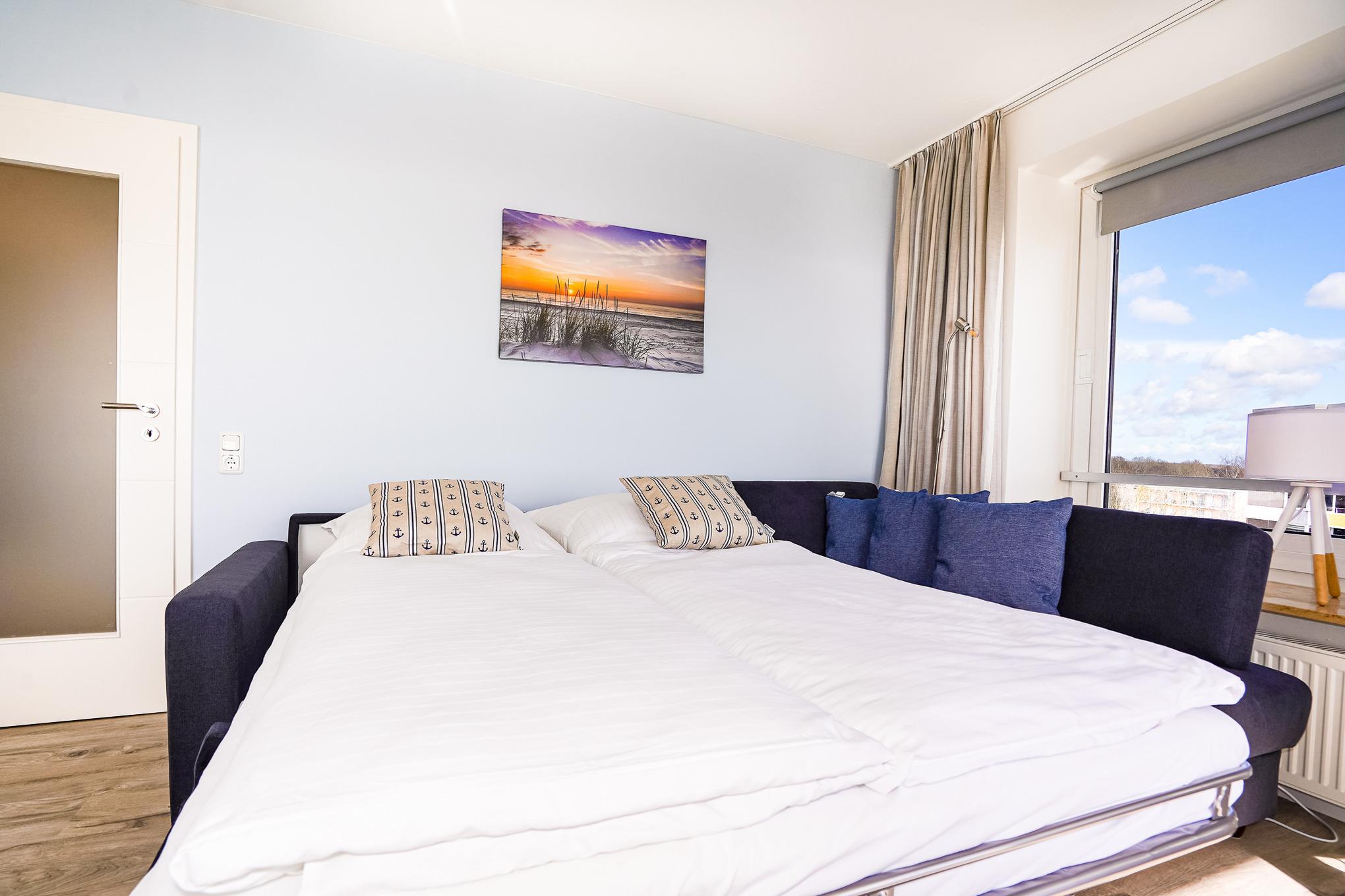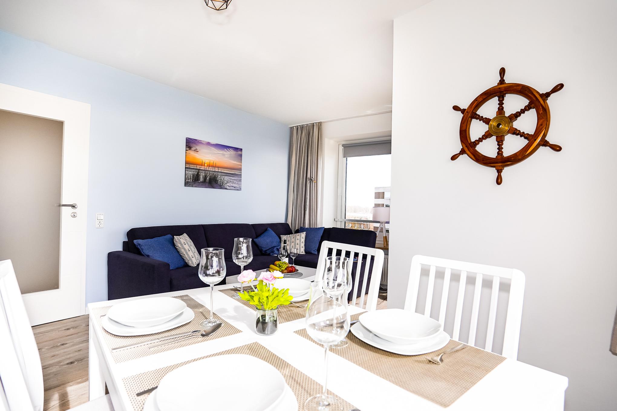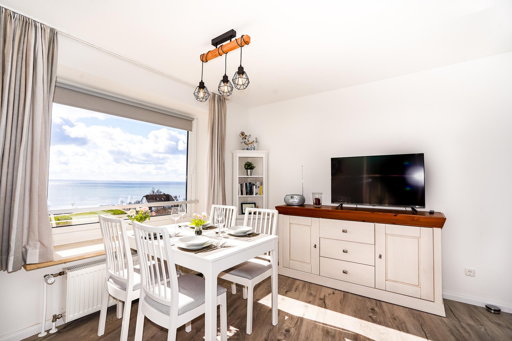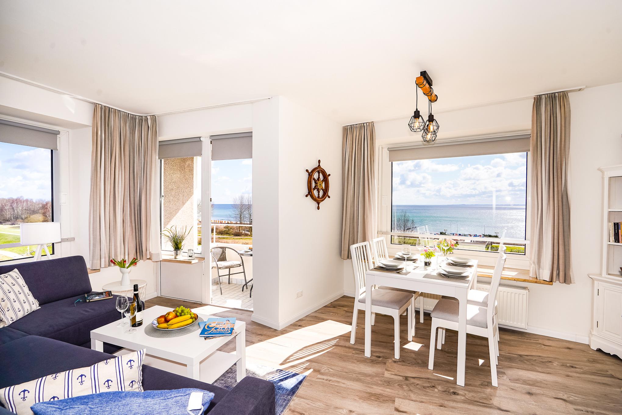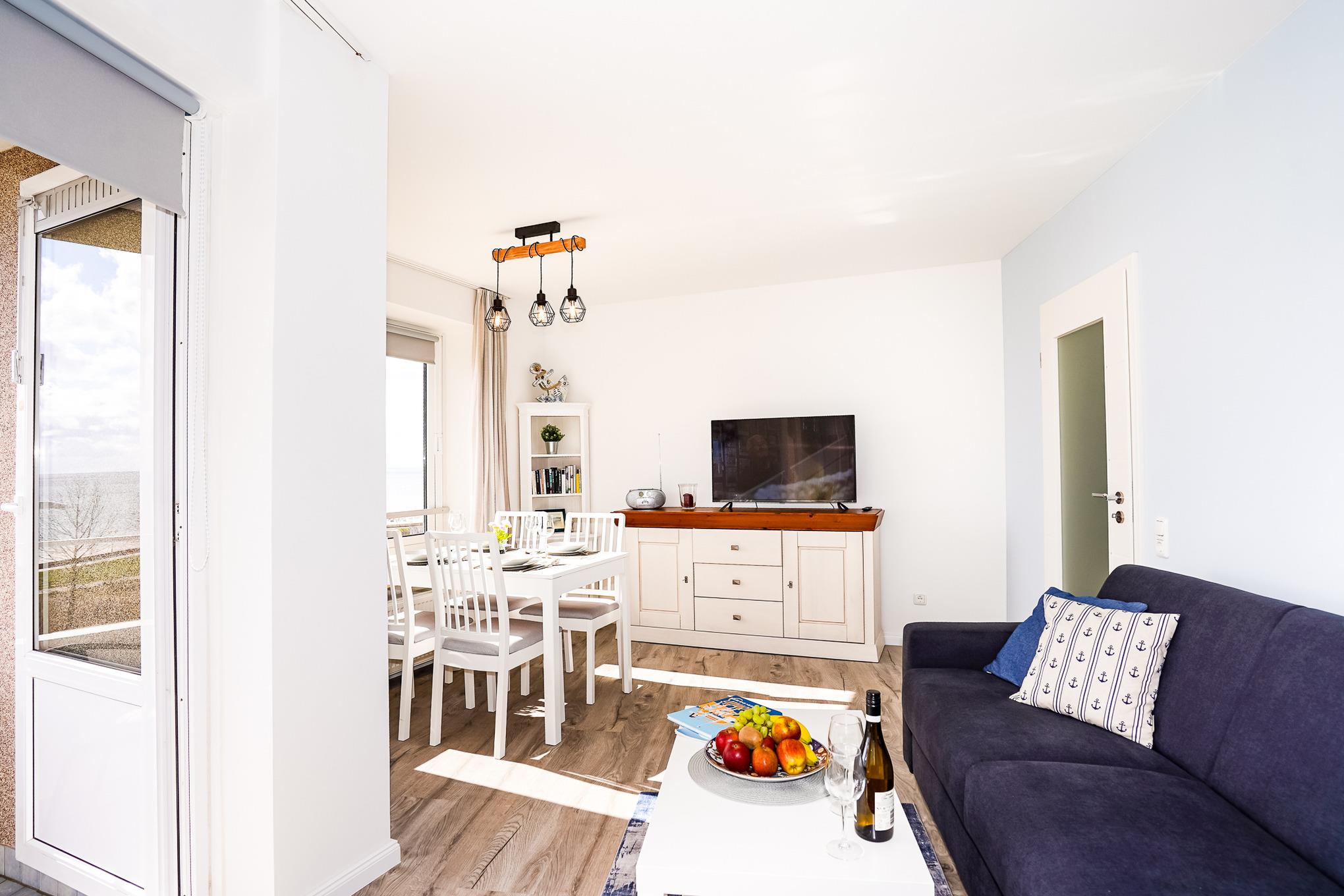 Das Wohnzimmer bietet Ihnen ein hochwertiges Sofa mit Matratze, welches als Schlafcouch (140 x 200) verwendet werden kann. Genießen Sie bereits beim Frühstück am großen Esstisch einen traumhaften Blick auf die Ostsee. Nach einem aufregenden Tag am Strand entspannen Sie vor dem großen Fernseher oder auf dem gemütlichen Balkon. Kostenloses W-LAN steht Ihnen selbstverständlich während Ihres Aufenthaltes zur Verfügung.