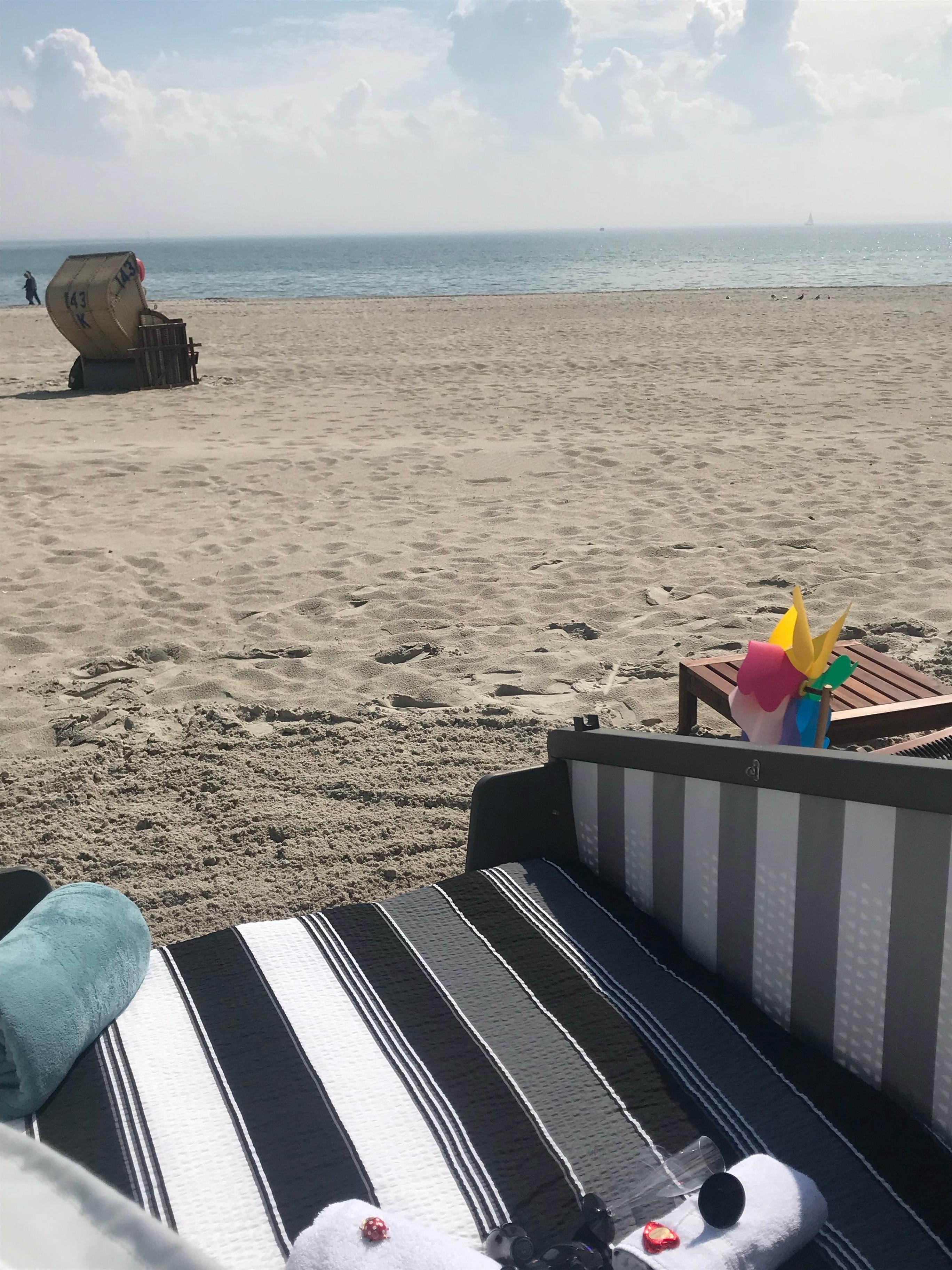 Romantischer Schlafstrandkorb direkt am Strand in Grömitz mit Ostseeblick und gemütlicher Ausstattung.