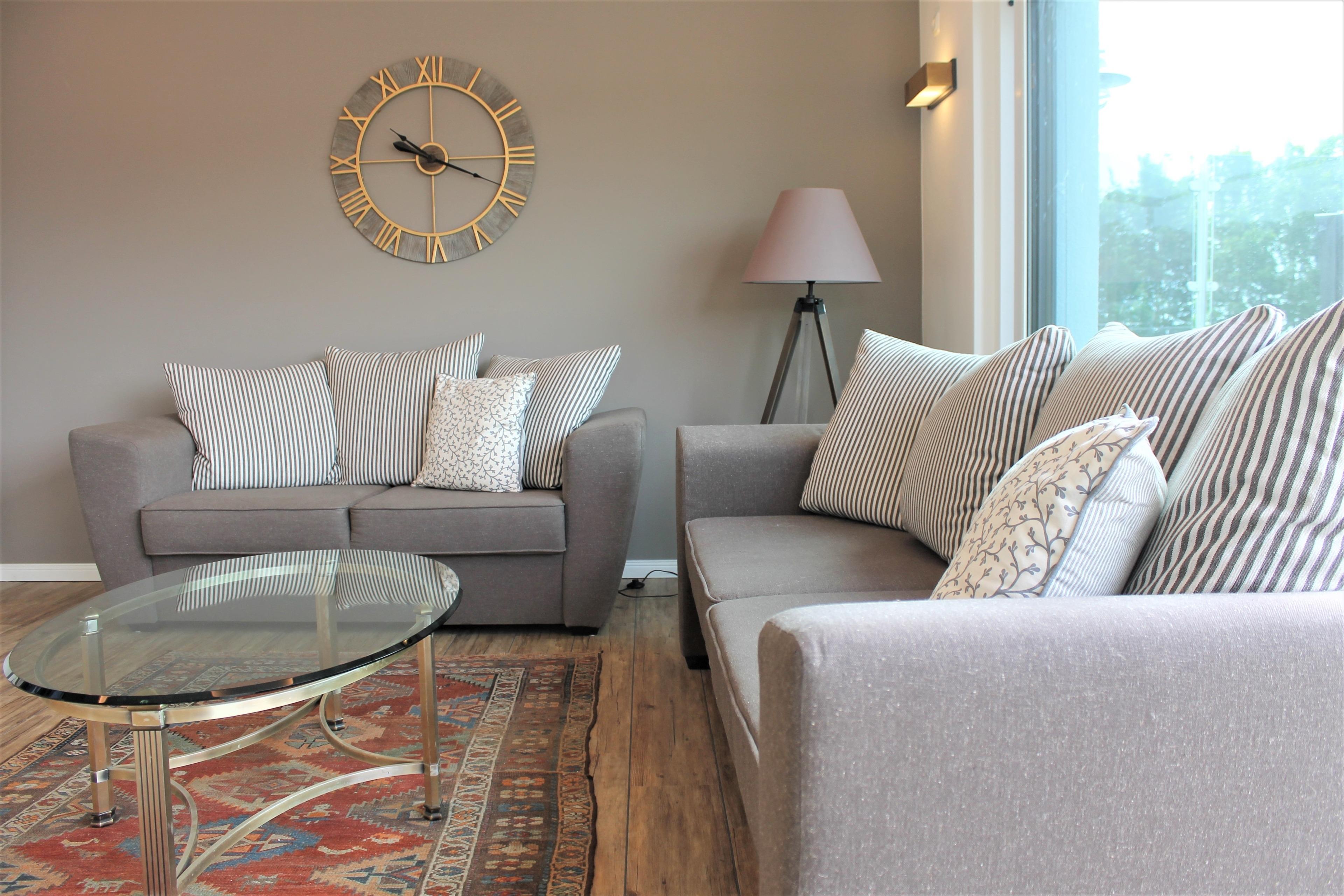 Diese Wohnung ist in Grömitz wohl einmalig und eine Oase zum Wohlfühlen. Eine große Terrasse mit Liegestühlen und Strandkorb erlaubt unbeobachtetes Sonnenbaden. Ideal auch für Gäste, die Ihre Zweisamkeit wirklich genießen möchten. Eine fast 6 Meter lange Fensterfront mit Schiebetürelement zur Südseite und vielen weiteren bodenlangen Fenstern lassen das Gefühl aufkommen, Sie säßen in einem Wintergarten. Auf der wunderbar großen Terrasse können Sie schon am frühen Morgen in der Sonne frühstücken und am Abend noch in der untergehenden Sonne zu Abend essen.