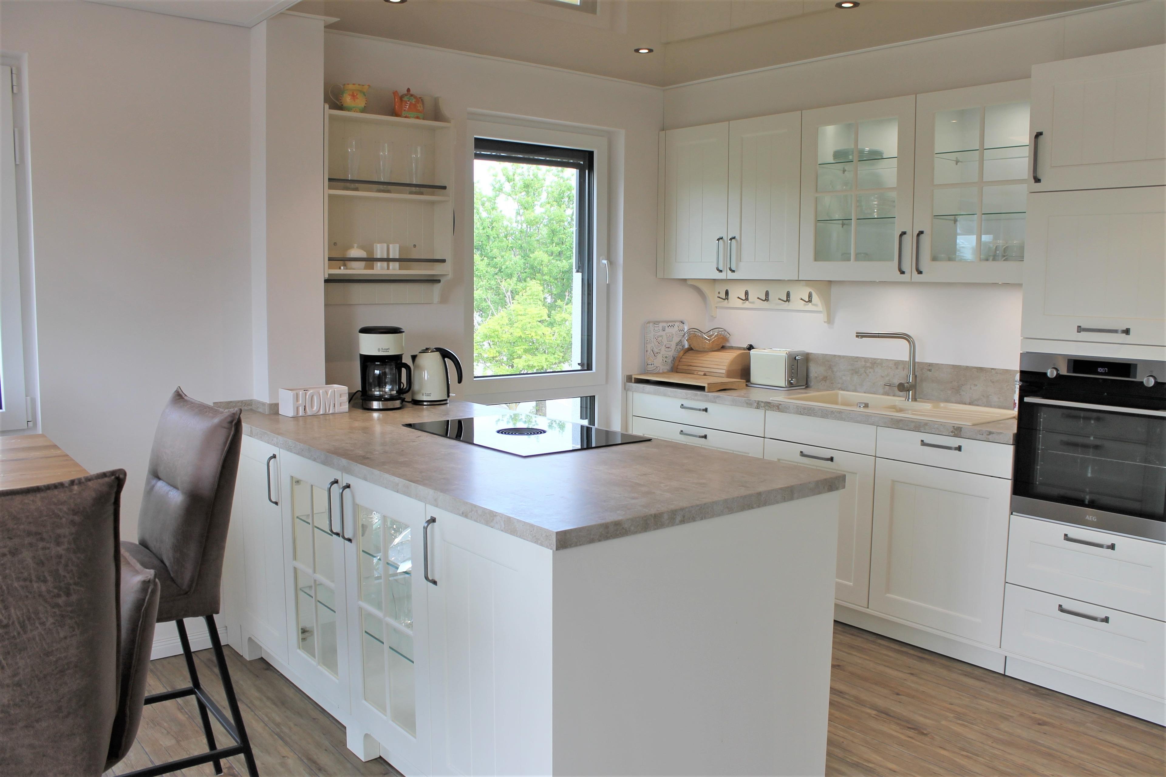 Hochwertige Küche mit Induktionsfeld in einer Kochinsel mit Dunstabzug nach unten (Bora), riesige Markise, seitl. ausziehbare Markise als Sichtschutz, die vor neugierigen Blicken schützt, alle Fenster bodenlang mit Sonnenschutzeinrichtungen außen und Plissees innen.
