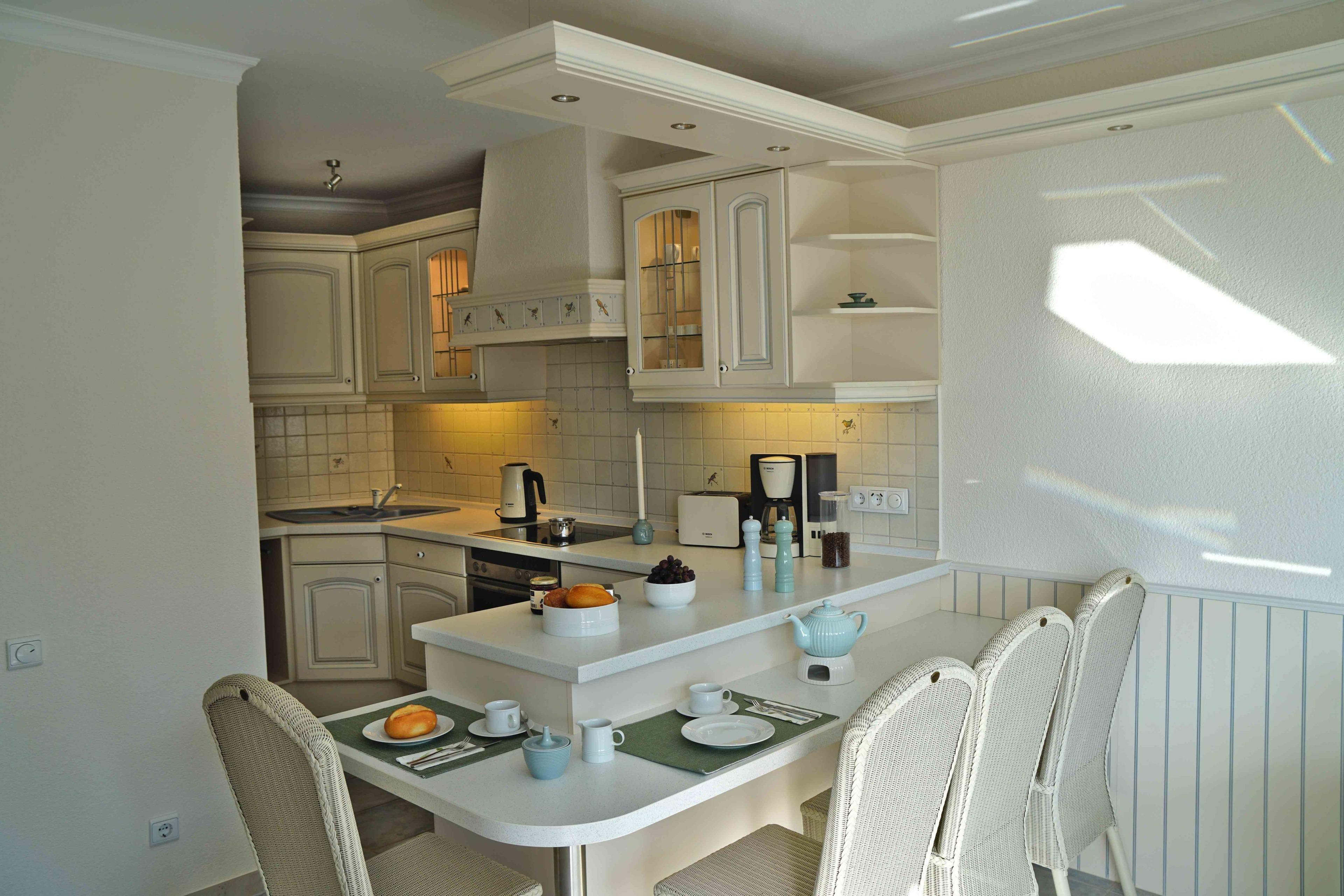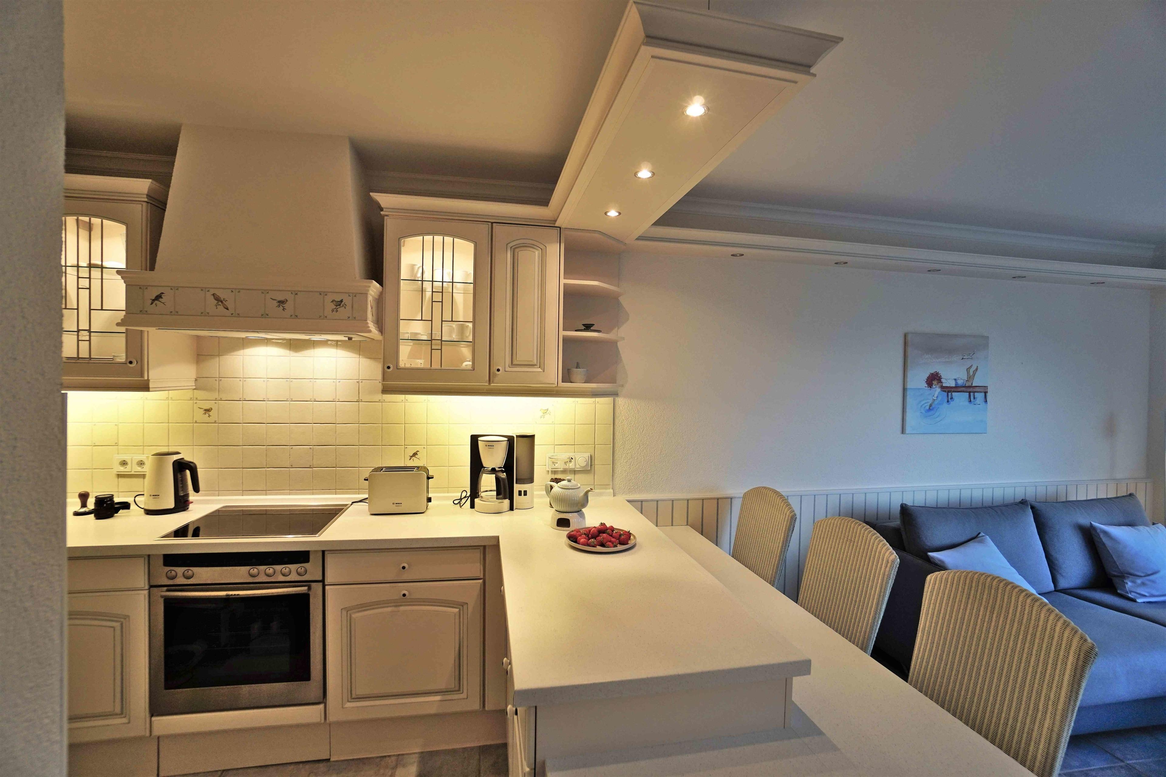 Die weiße Friesen-Küche verfügt über einen Backofen, Cerankochfeld, Spülmaschine, Kühlschrank, Gefrierschrank, diverse Elektrokleingeräte sowie viel Stauraum.
