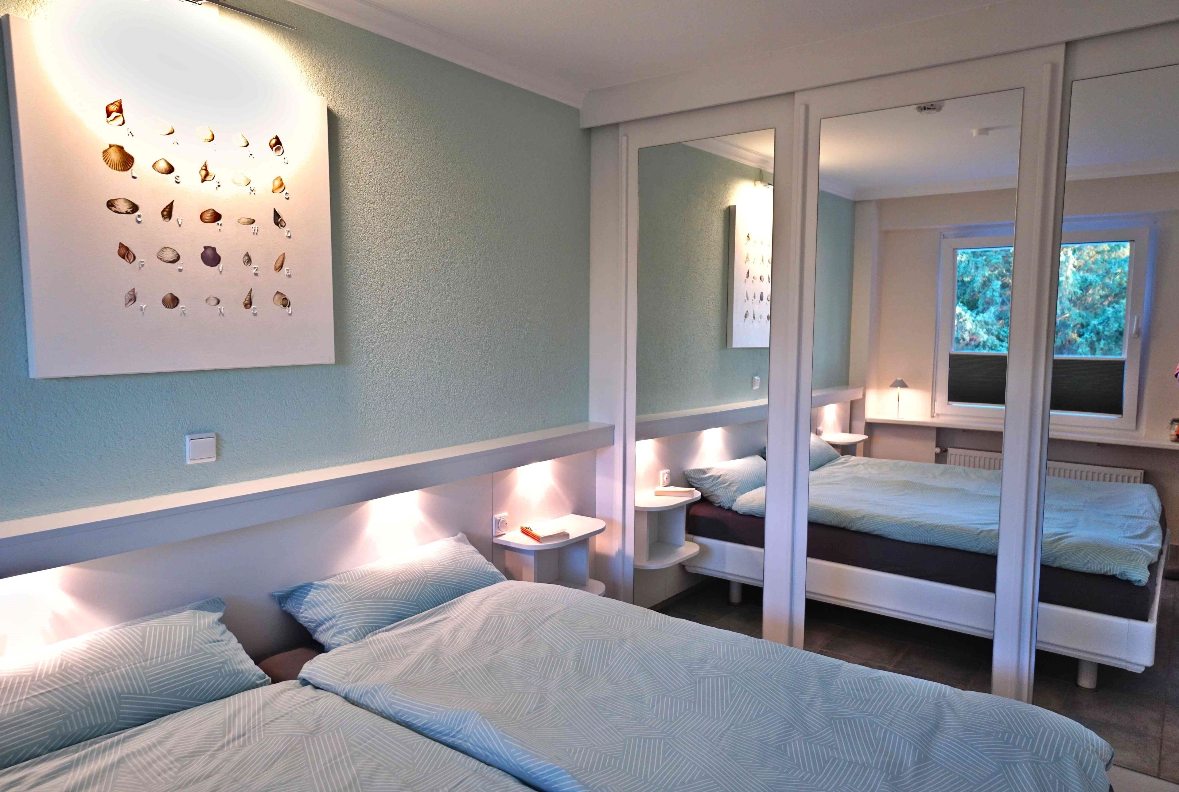 Im Schlafzimmer finden Sie ein Doppelbett (180 x 200cm) und einen großen Einbaukleiderschrank mit Ganzkörperspiegel vor. Higlight ist das an das Schlafzimmer angrenzende "Bad en suite". Hier finden Sie eine große Runddusche, WC und Waschbecken sowie einen Handtuchheizkörper vor.