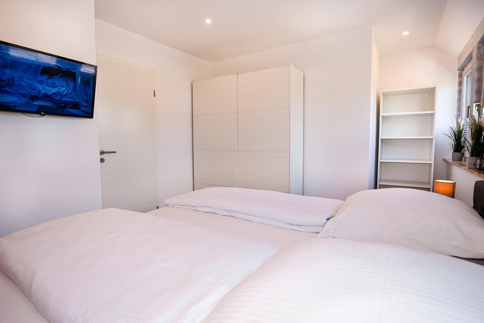 Im zweiten Schlafzimmer finden Sie ein bequemes Boxspringbett (160x200), einen Kleiderschrank und ebenfalls einen Fernseher vor. Die Fenster lassen sich durch Plissees verdunkeln.