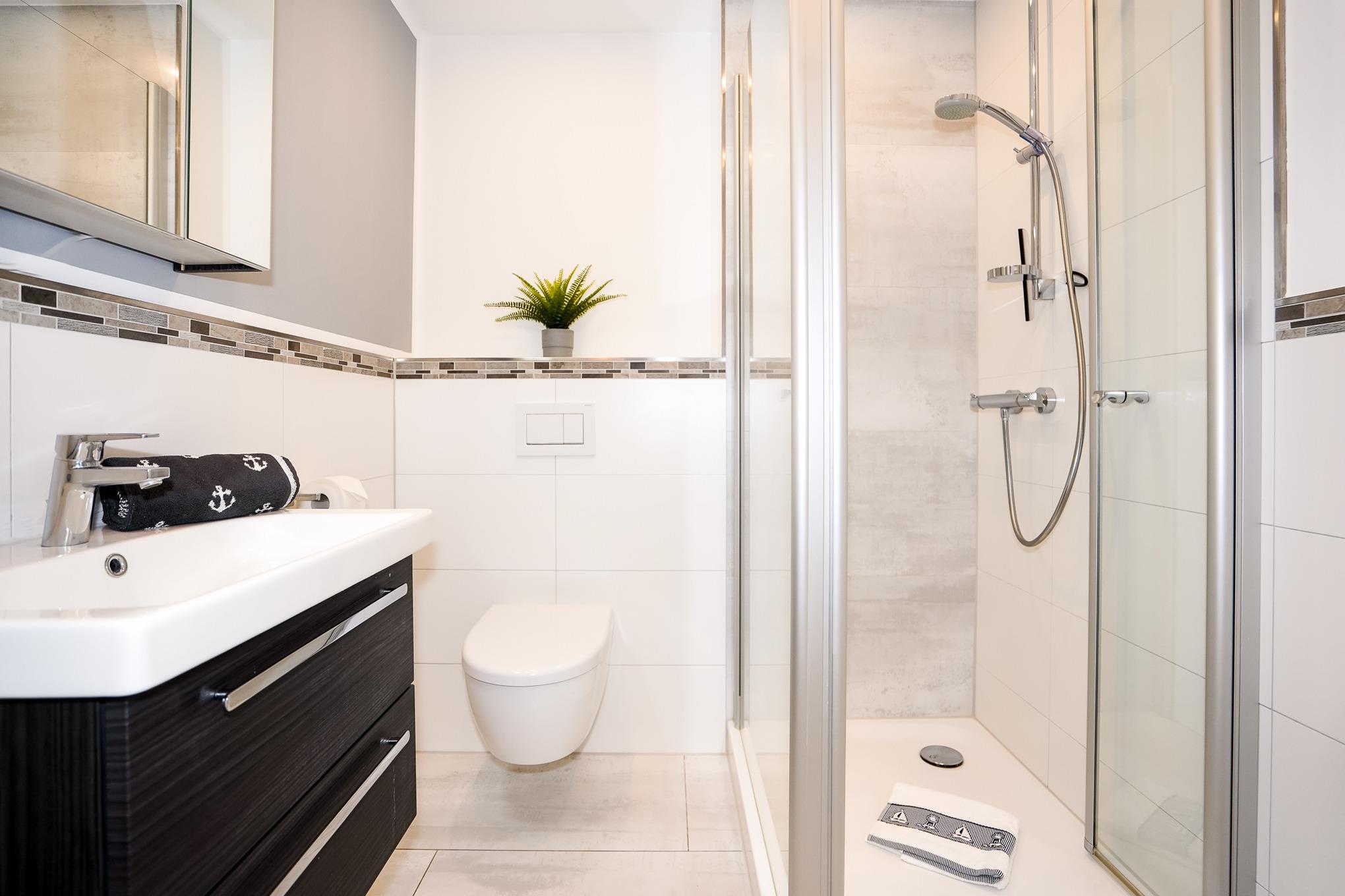 Im modernen Badezimmer mit großzügiger Dusche finden Sie diverse Ablagemöglichkeiten und einen Handtuchheizkörper vor.