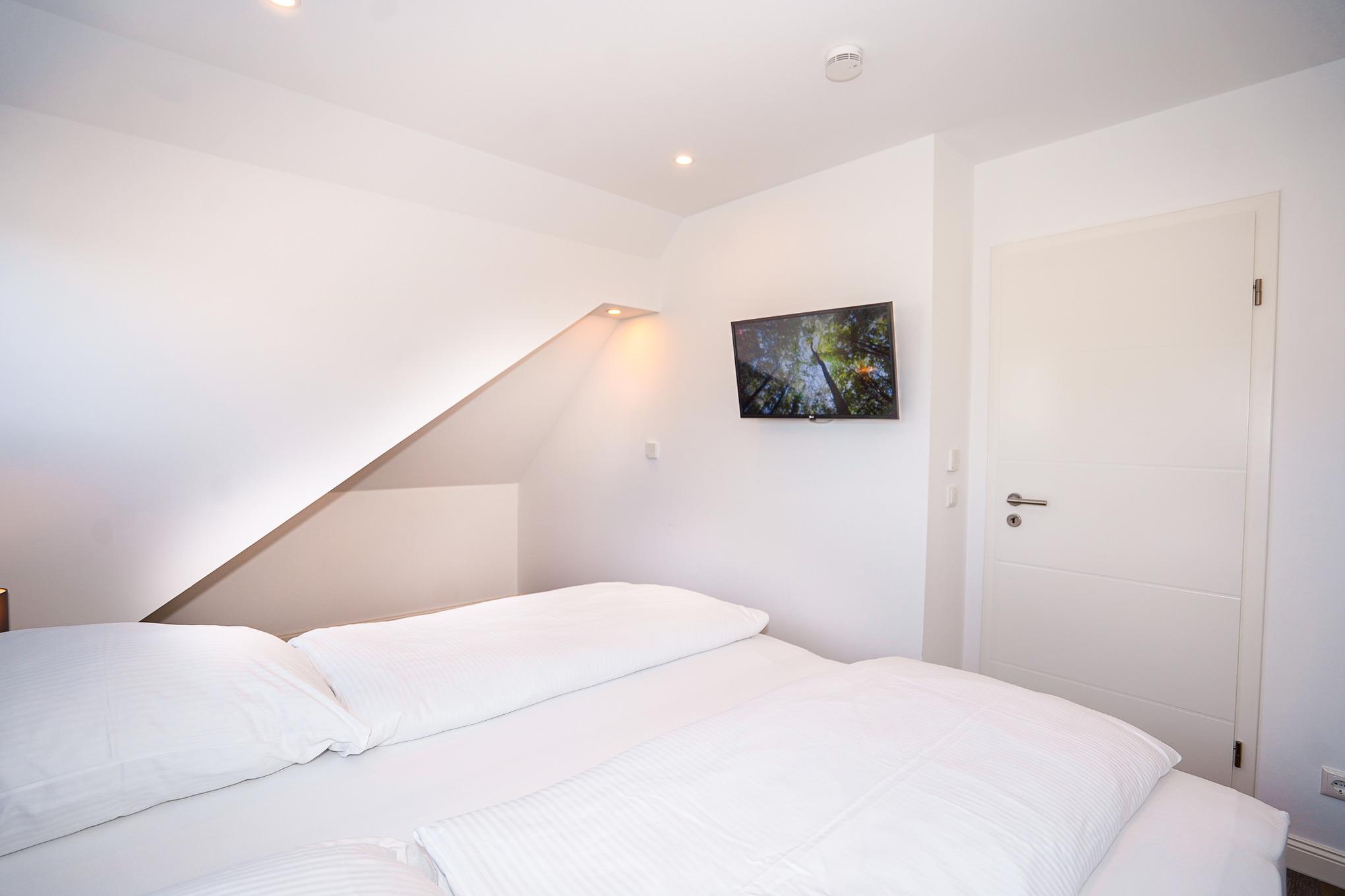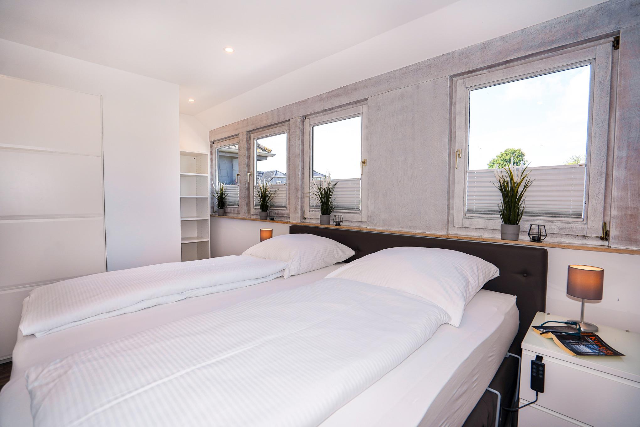 Das erste Schlafzimmer verfügt über ein großes Boxspringbett (200x200). Die hochwertigen Matratzen lassen sich einzeln und elektrisch verstellen. Ein Kleiderschrank, Nachttische und ein eigener Fernseher ergänzen die Ausstattung.