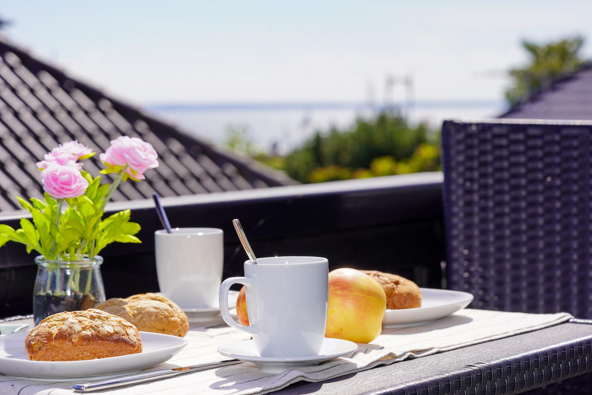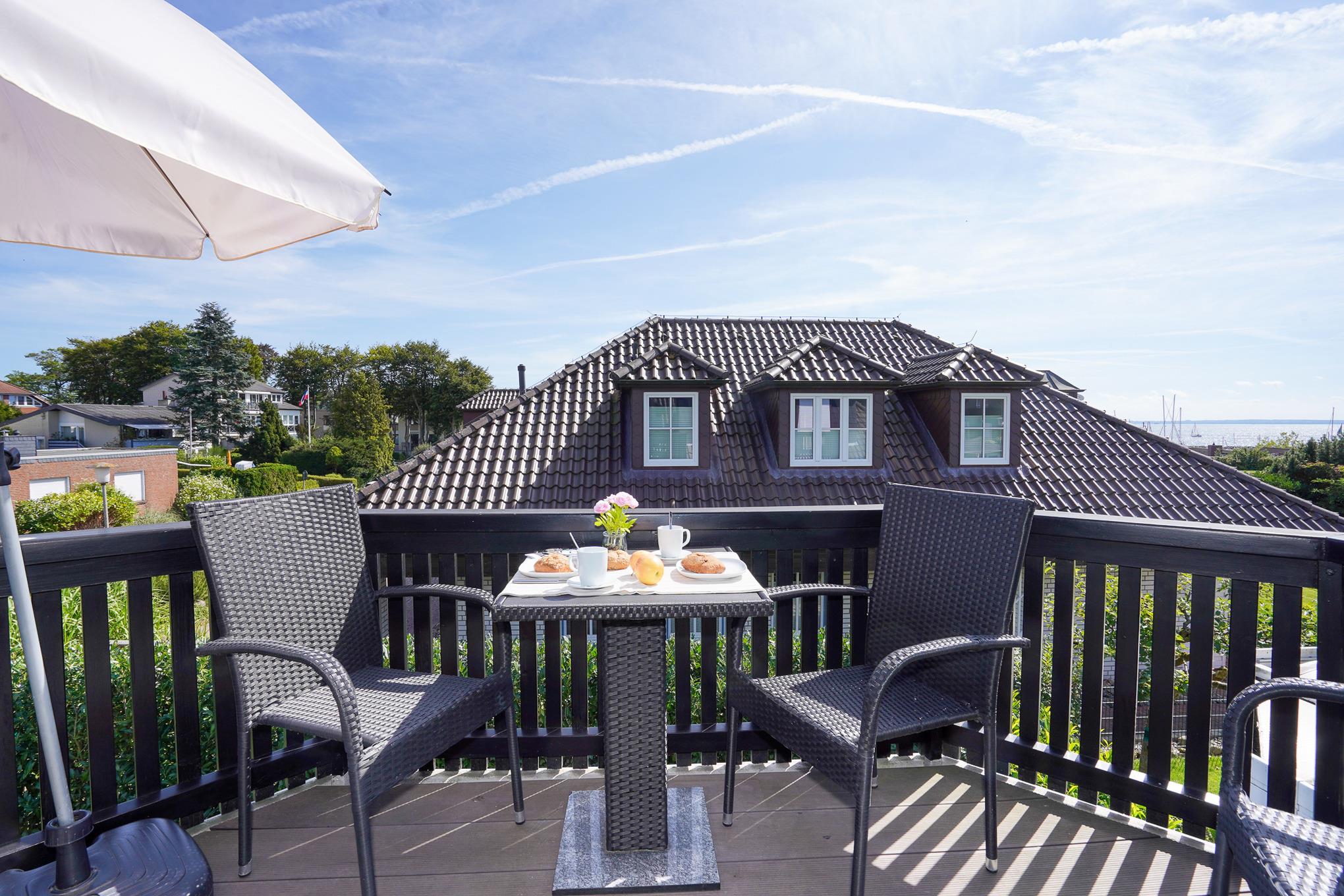 Genießen Sie auf dem gemütlichen Balkon bereits zum Frühstück die ersten Sonnenstrahlen mit dem Blick zum Yachthafen. Aufgrund der ruhigen Lage können Sie hier den ganzen Tag entspannen.