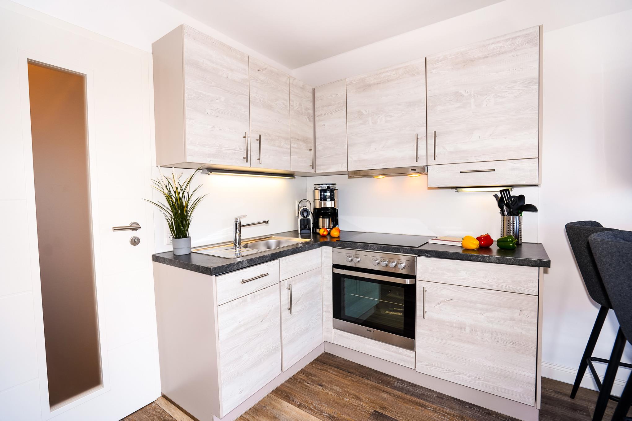 Die stilvolle und offene Küche ist mit allen erforderlichen Geräten wie Backofen, Cerankochfeld, Spülmaschine, Kühlschrank mit Gefrierfach und diversen Elektrokleingeräten ausgestattet. Ihre Mahlzeiten nehmen Sie am angrenzenden Hochtisch ein.