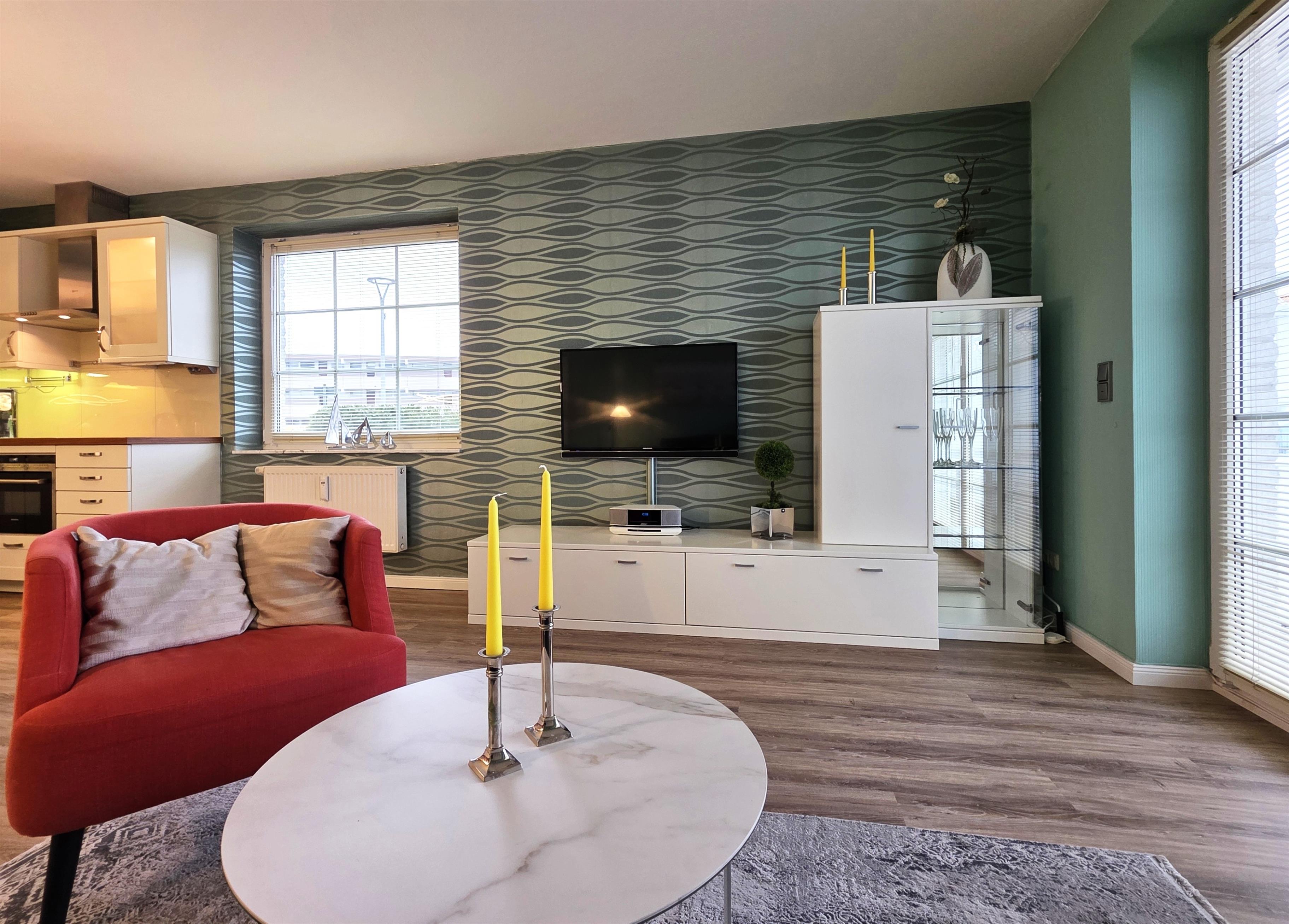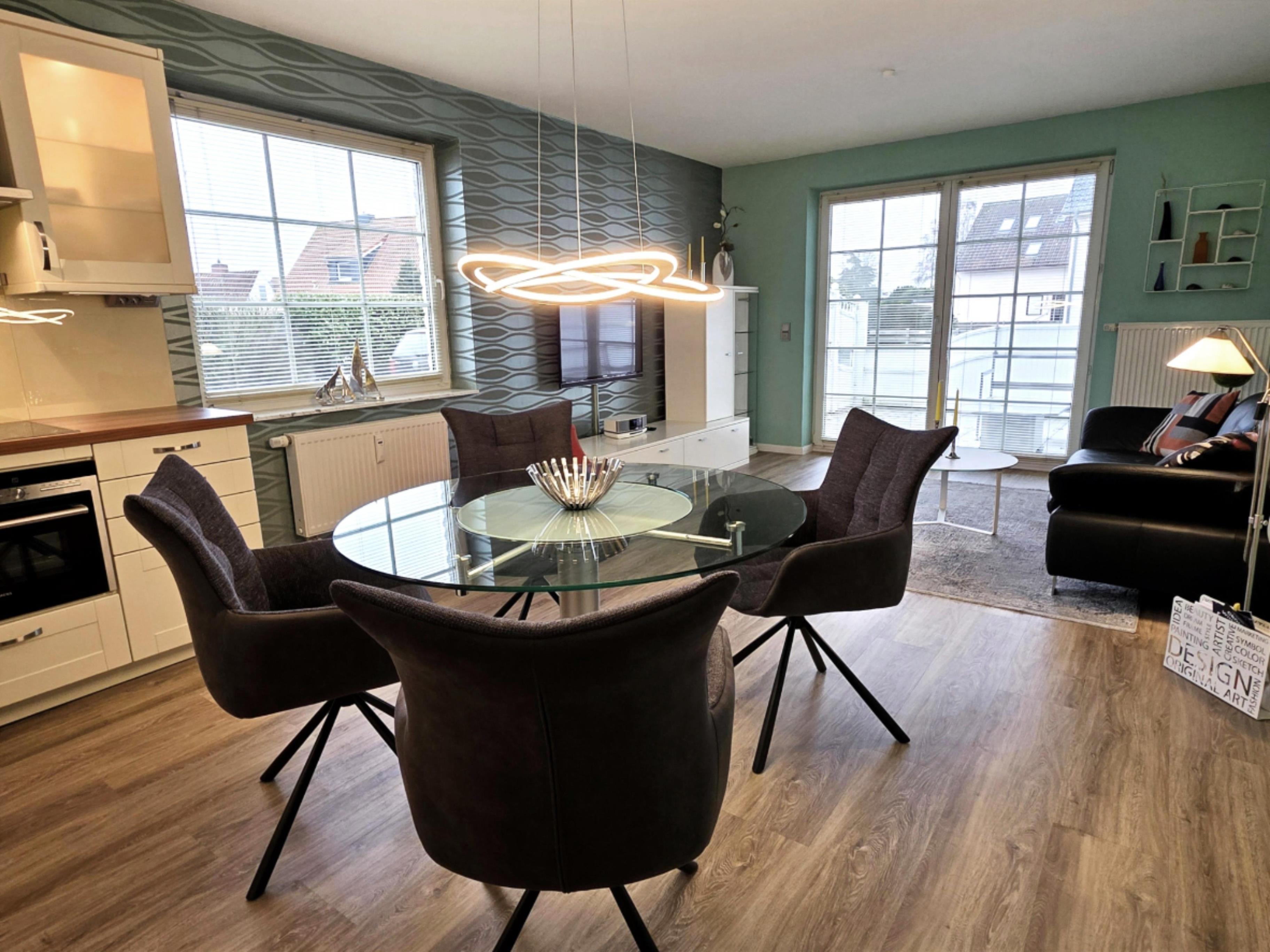 Im modernen Wohnbereich befindet sich eine gemütliche Couchgarnitur mit Flachbild-TV, ein Essplatz für 4 Personen und Zugang zur Terrasse.