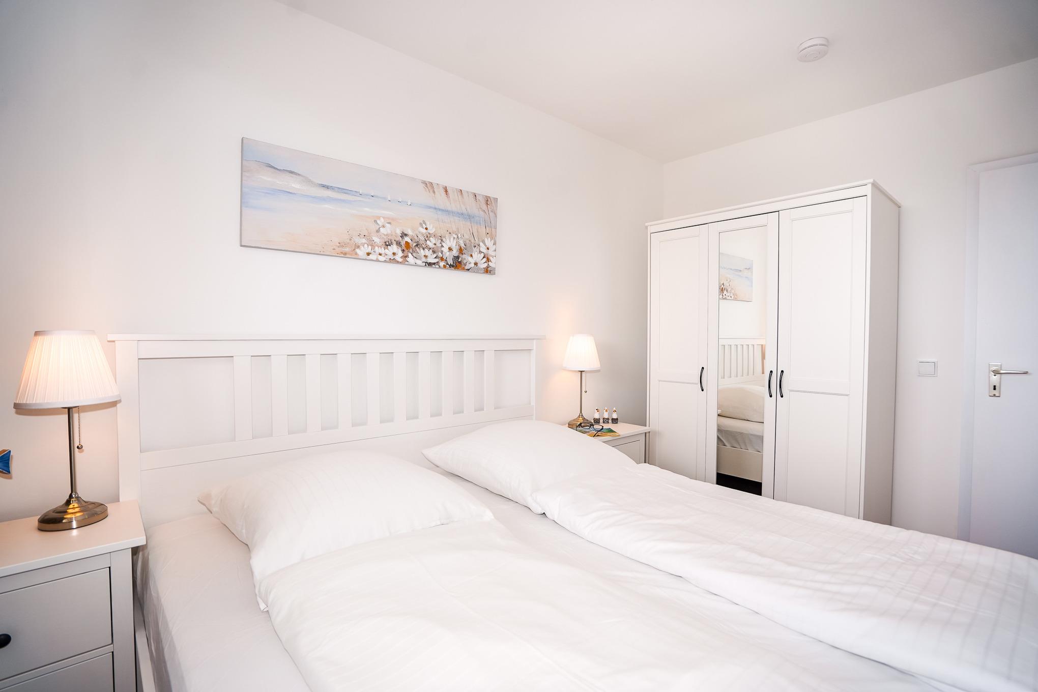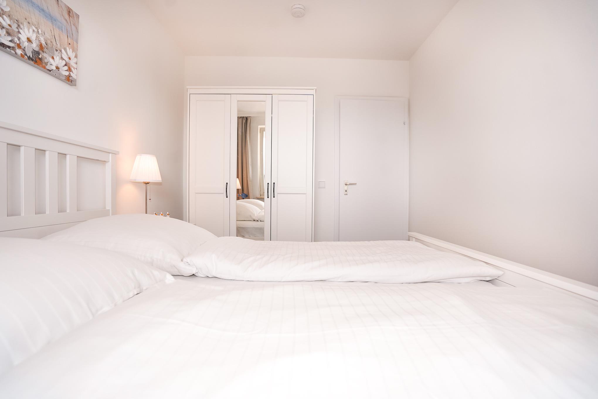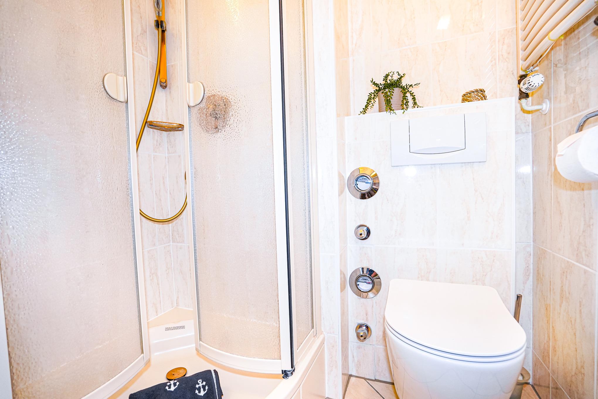 Das Schlafzimmer ist mit einem bequemen neuen Doppelbett (180x200, durchgehende Matratze), einem Kleiderschrank und zwei Nachttischen möbliert. Im geschmackvollen Badezimmer finden Sie eine Runddusche, WC und Waschbecken sowie einen großen Spiegelschrank vor.