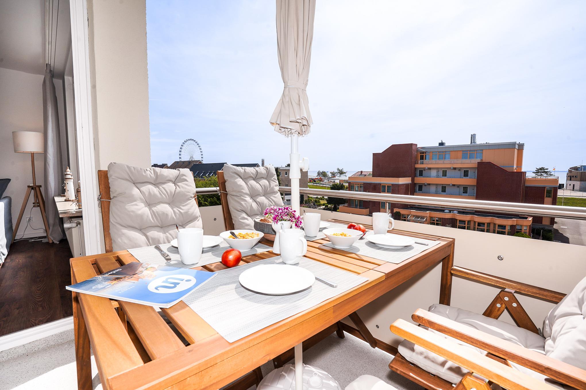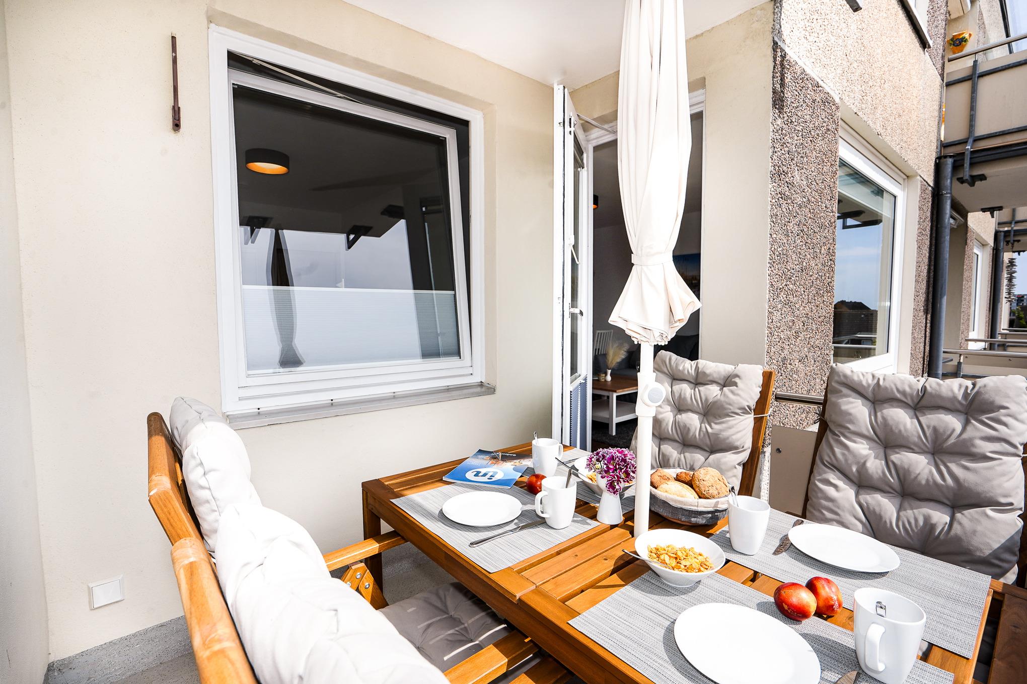 Auf dem Balkon, welcher über einen großen Tisch mit vier Stühlen verfügt, können Sie die Sonne genießen. Ein Teilseeblick ist hier inbegriffen.