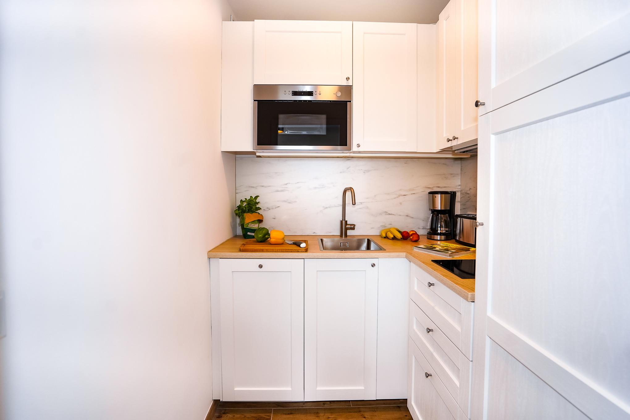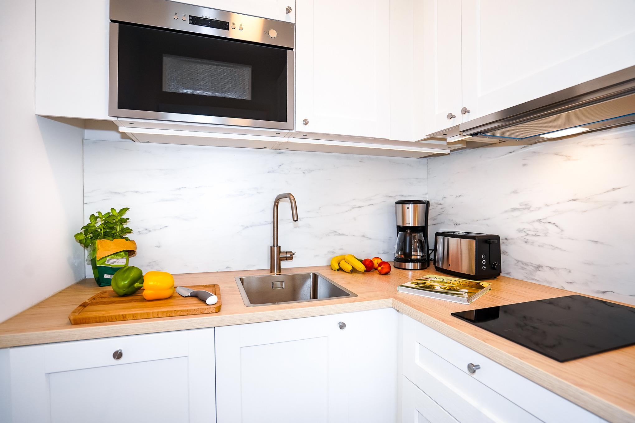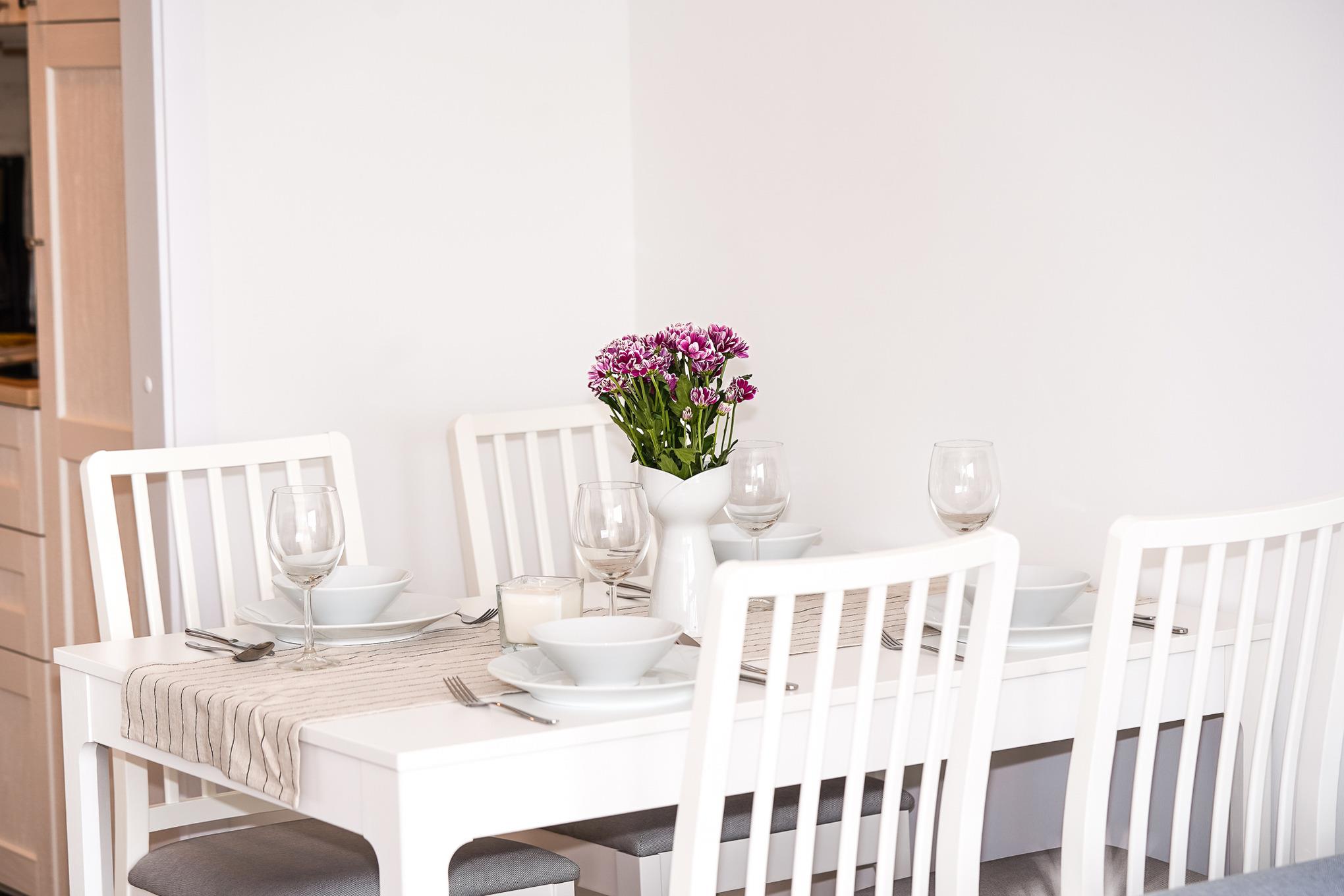 Das Wohnzimmer ist mit einer Schlafcouch, einem Esstisch und einem großen Fernseher ausgestattet. Kostenloses W-LAN steht Ihnen hier selbstverständlich zur Verfügung. Die an das Wohnzimmer angrenzende neue Küche ist mit einer Spülmaschine, Kühlschrank mit Gefrierfach, Mikrowelle und einem Herd mit zwei Kochfeldern ausgestattet.