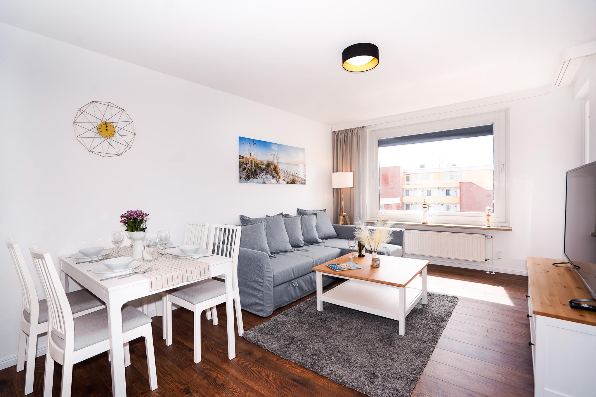 Diese modernisierte und mit neuen Möbeln ausgestattete 2-Zimmer-Ferienwohnung befindet sich im 3. Stock des Appartementhauses Wiking. Die Wohnung erreichen Sie bequem mit dem Fahrstuhl.