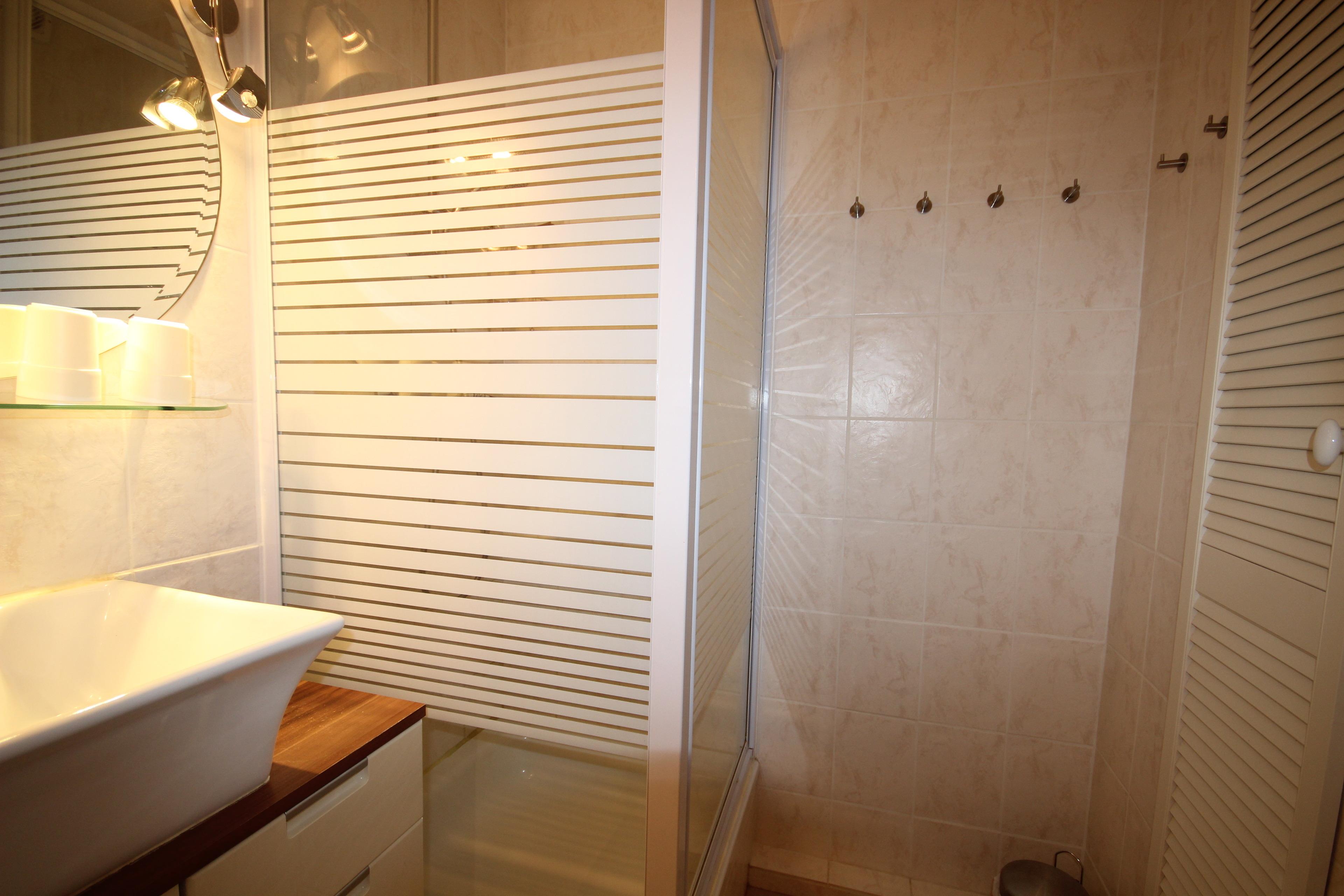 Helles, modernes Bad mit Dusche + Trennwand, WC und Waschbecken incl. Unterschrank.