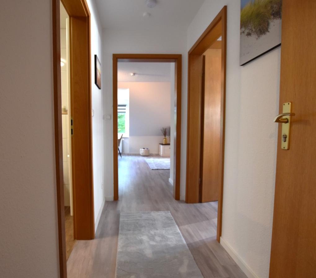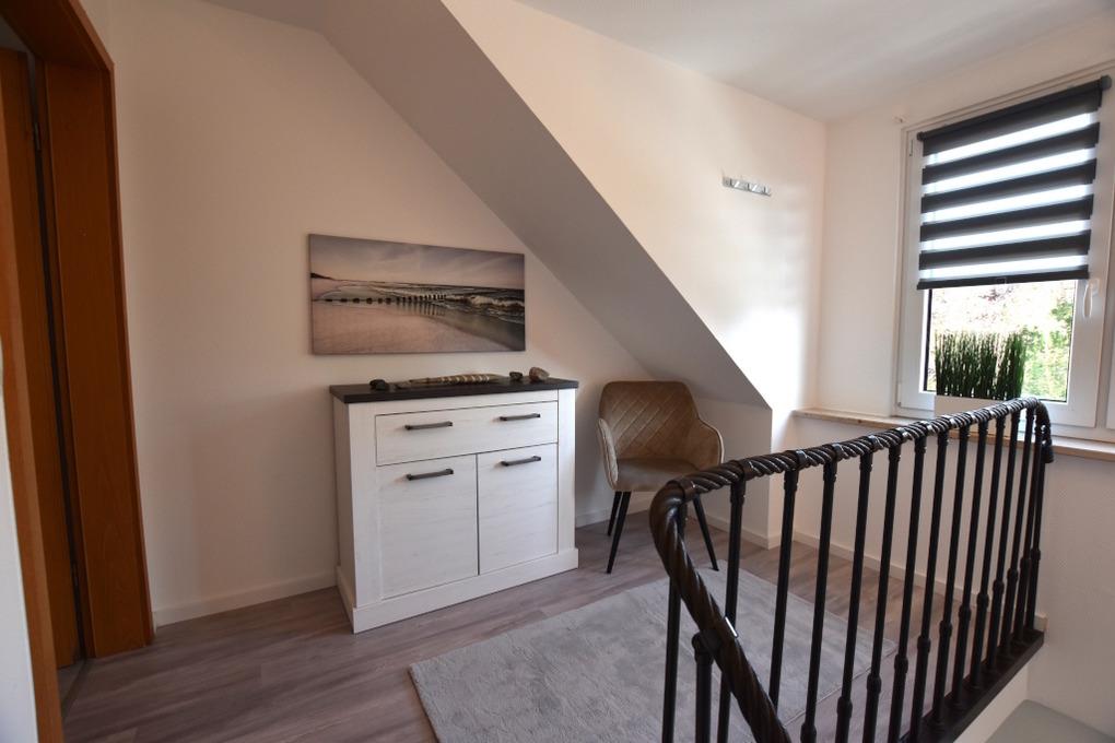 Treppenaufgang mit Vorflur, Eingangsflur, Schlafzimmer mit Boxspringbett (1 x 180 cm x 200 cm), TV und Kleiderschrank. ein Duschbad mit Spiegelschrank. Wohn-/Esszimmer mit offener Küche, Schlafsofa (160x200) und Essecke.