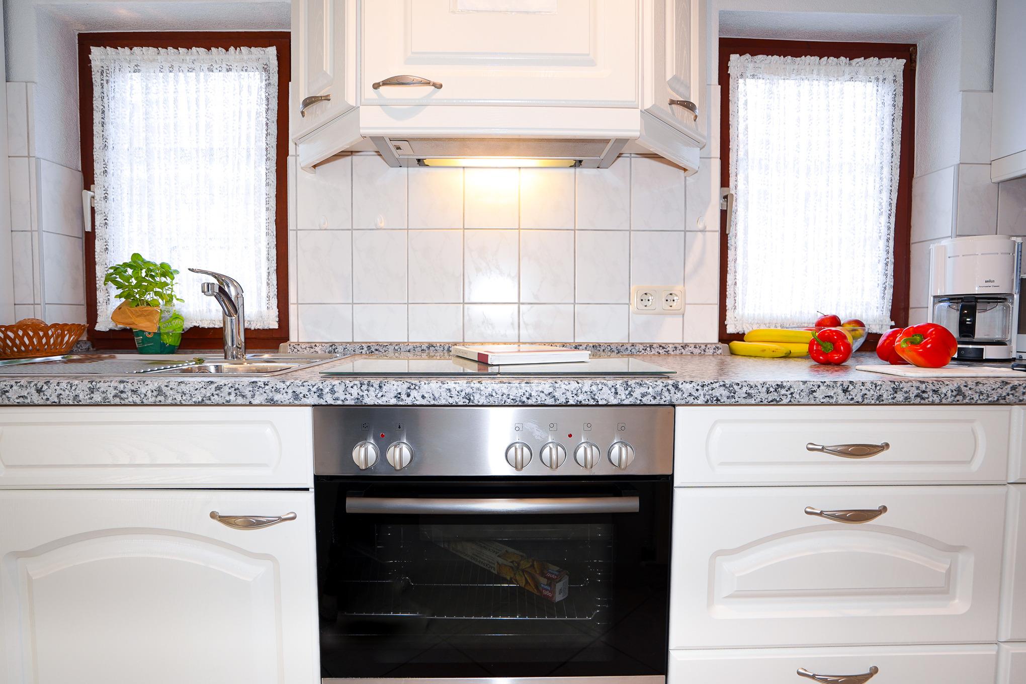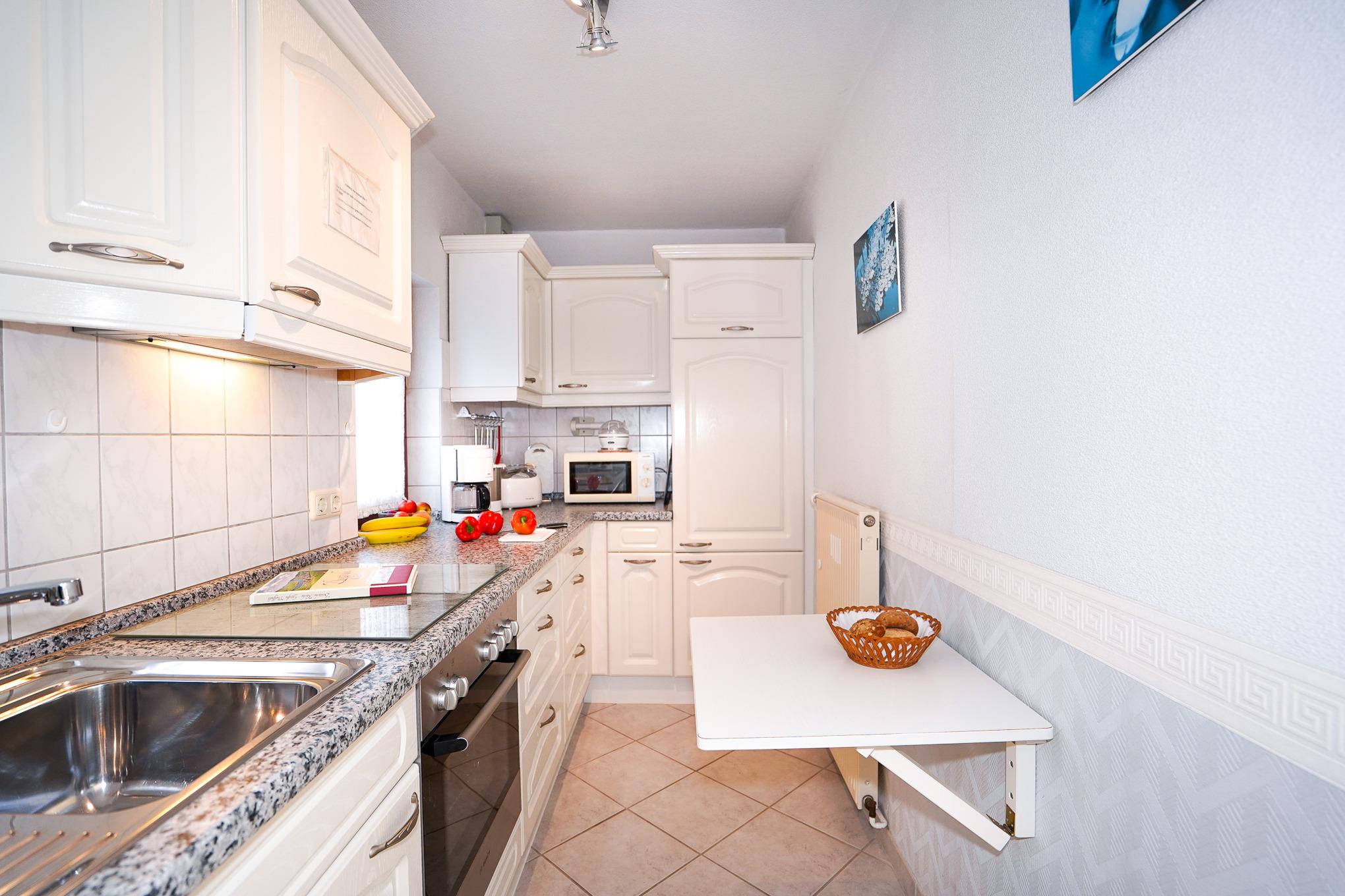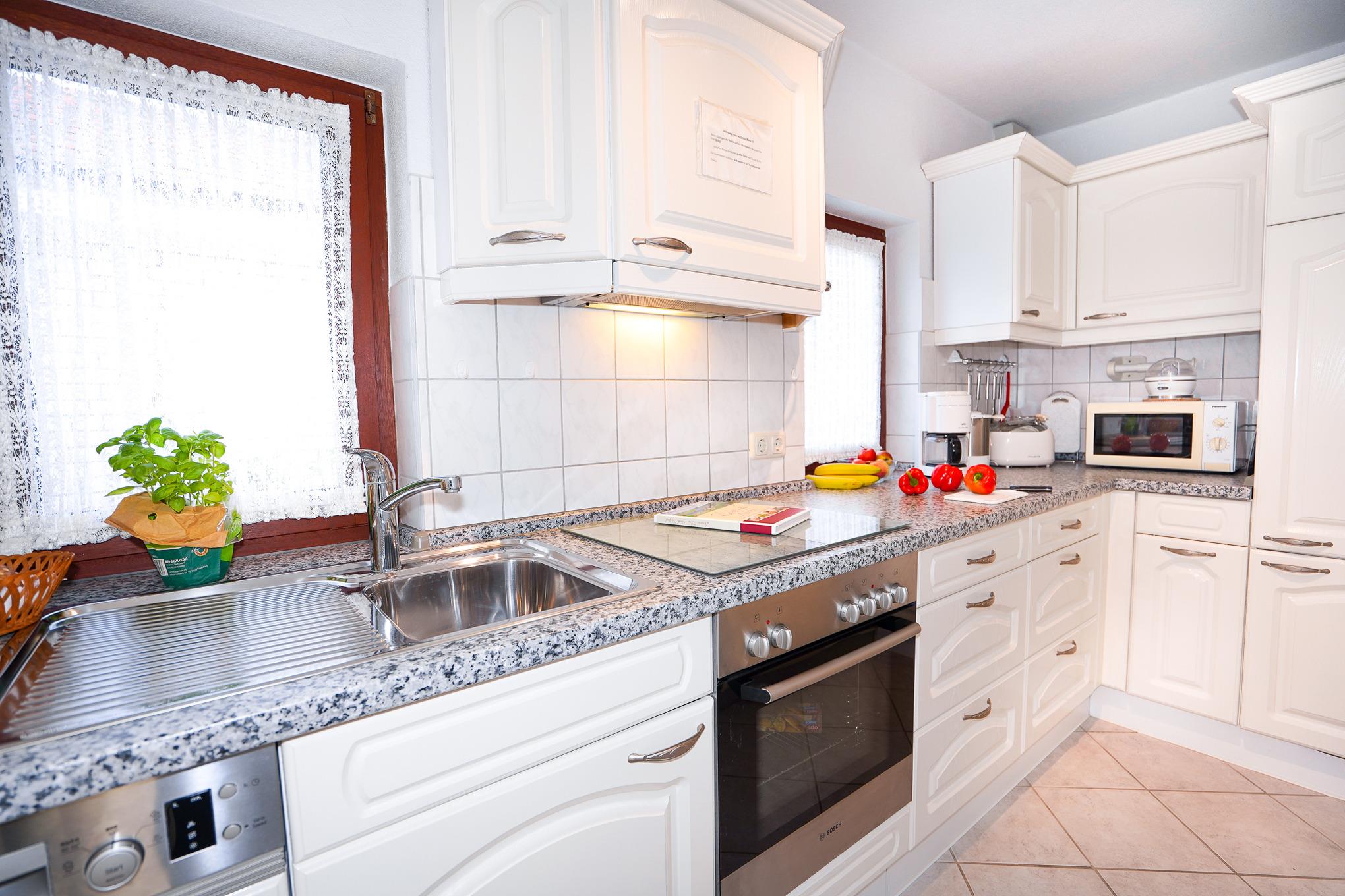 Eine komplett eingerichtete weiße Küche im Landhausstil lässt keine Wünsche offen. Zur Ausstattung gehören ein Backofen, Cerankochfeld, Spülmaschine, Kühlschrank mit Gefrierfach und eine Mikrowelle.