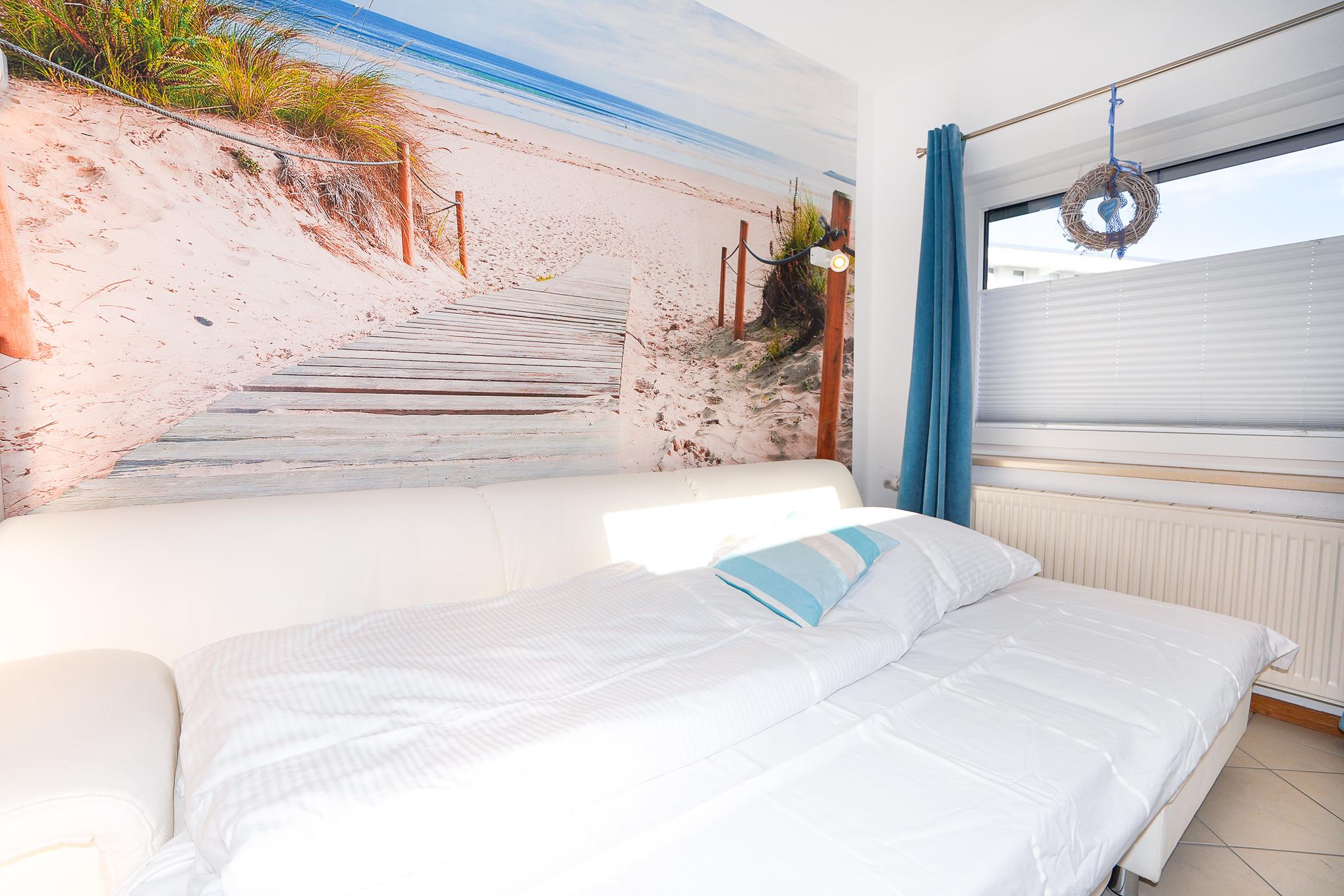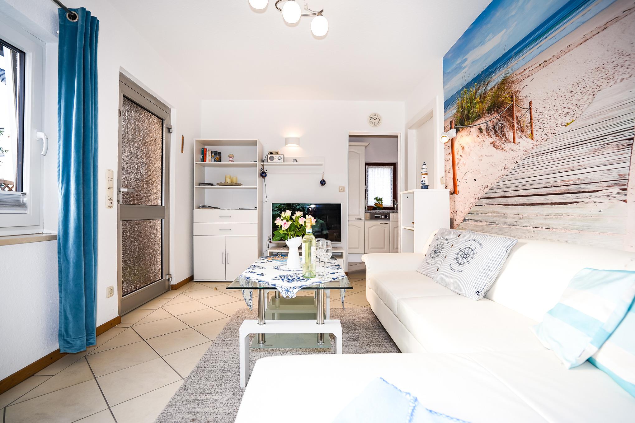 Der Bungalow wird über einen eigenen Eingang und den idyllisch gelegenen Garten betreten. Hier erwartet Sie ein gemütliches Wohnzimmer mit einem Ecksofa, Sessel und einem großen Fernseher. Das Sofa ist als Schlafsofa ausgestattet und bietet einen zusätzlichen Schlafplatz für Ihren Nachwuchs.