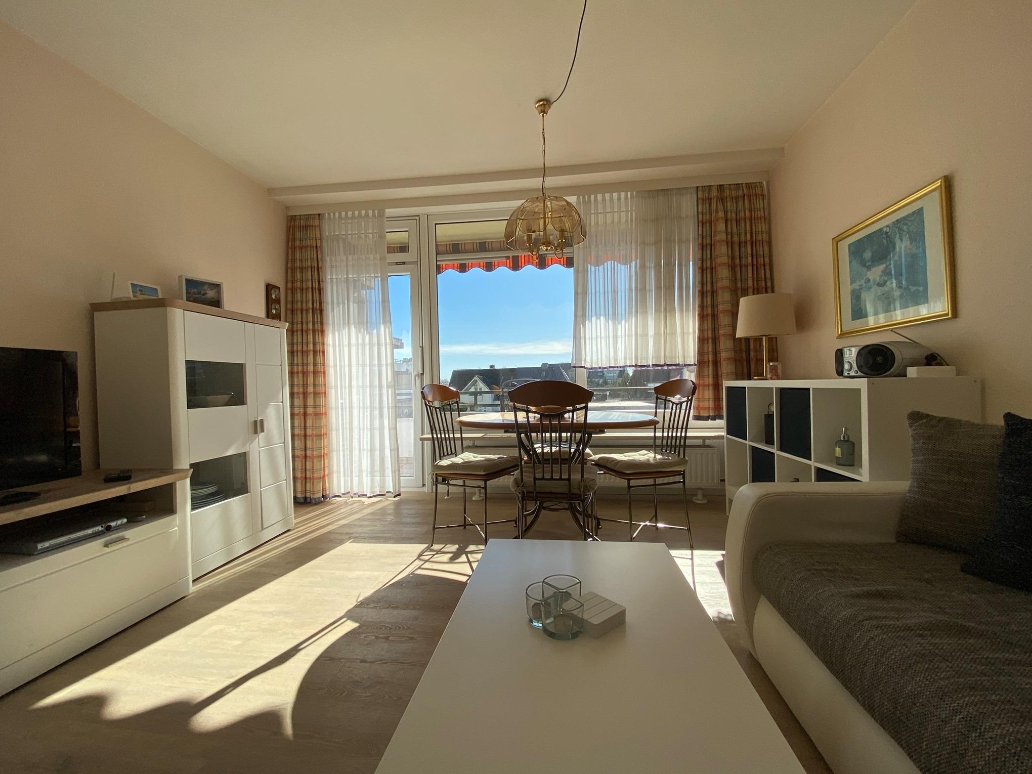 Im hellen, geschmackvollen Wohnbereich befindet sich eine bequeme Couchgarnitur (Platz für max. einen Erwachsenen oder 2 Kinder), Flach-TV, Radio/CD und Essplatz. Auf dem möblierten, sonnigen Süd-Ost- Balkon können Sie die Sonne richtig genießen.