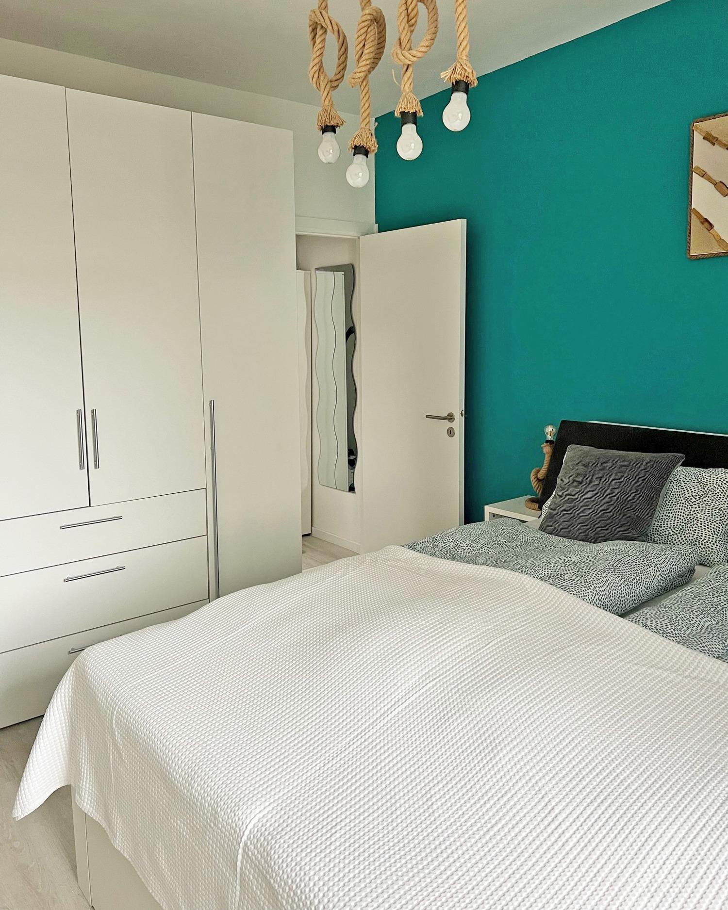 Das Schlafzimmer besteht aus einem großen Doppelbett (180x200cm, Topper auch vorhanden), einem Flachbildfernseher (an der Wand montiert) und einem großen Kleiderschrank. Hier können Sie Ihre Urlaubsgarderobe bequem verstauen. Die Fenster können mit Plissees und Vorhängen verdunkelt werden.