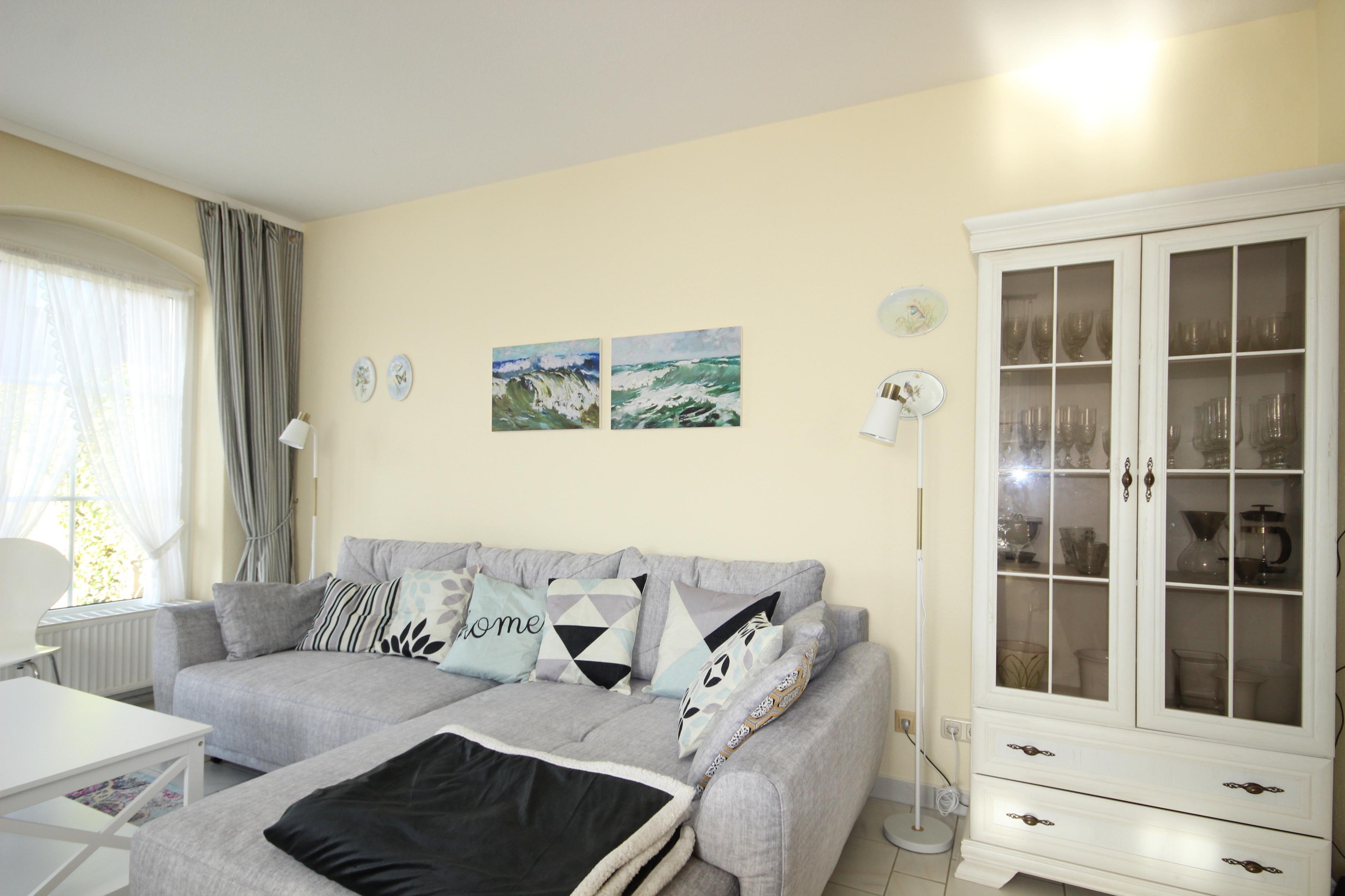 Der Wohnbereich ist möbliert mit einer großzügigen Couchgarnitur, Essecke, Schränke, Kabel-TV und einem Zugang zur Süd-Ost-Terrasse.
