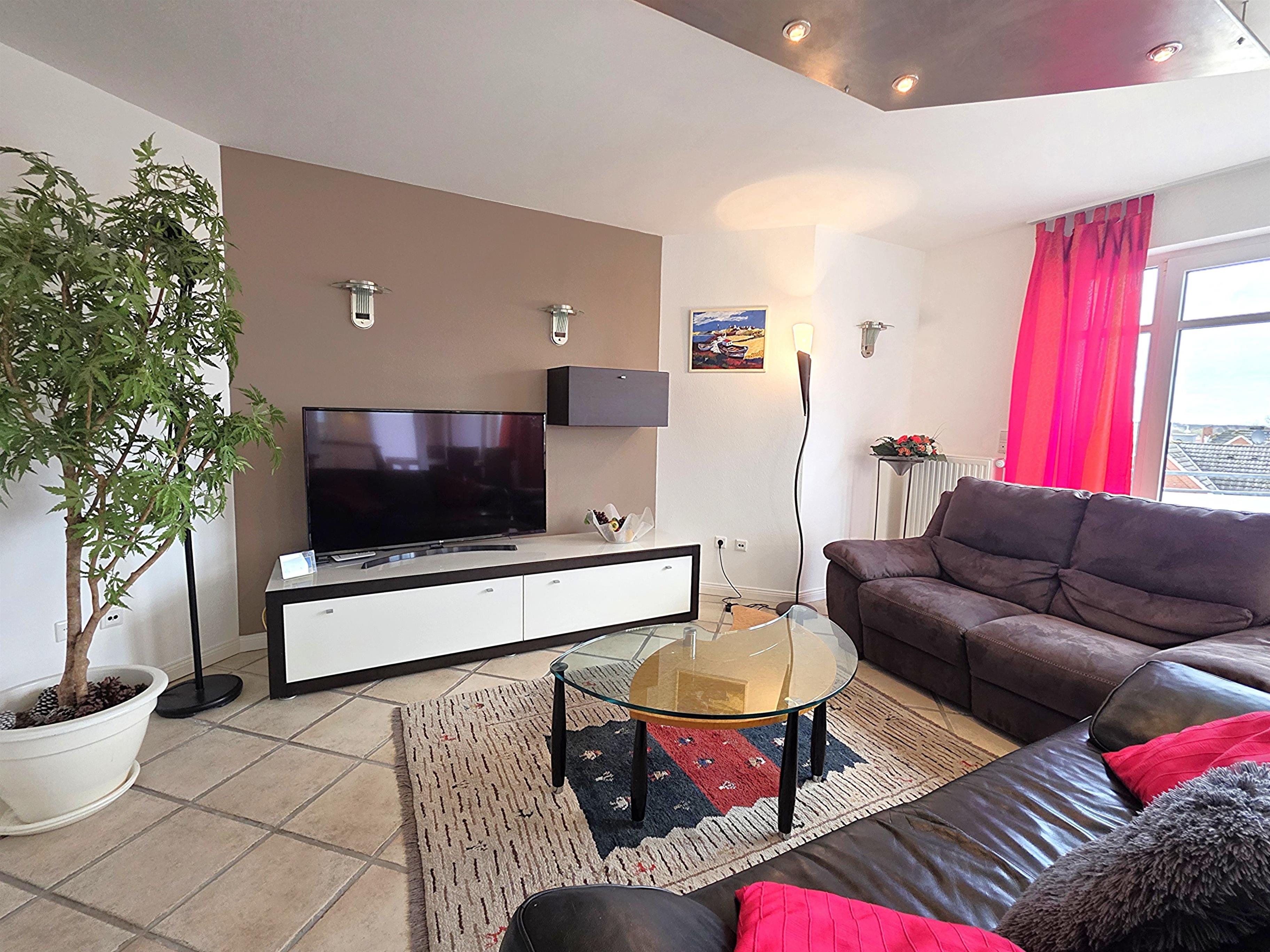 Das gemütliche, helle Wohnzimmer ist mit einer bequemen Couchgarnitur, Essplatz, Kabel-TV, DVD-Player, Video-Recorder & Stereoanlage eingerichtet. Hier haben Sie Zugang zum möblierten Nord-Ost-Balkon.
