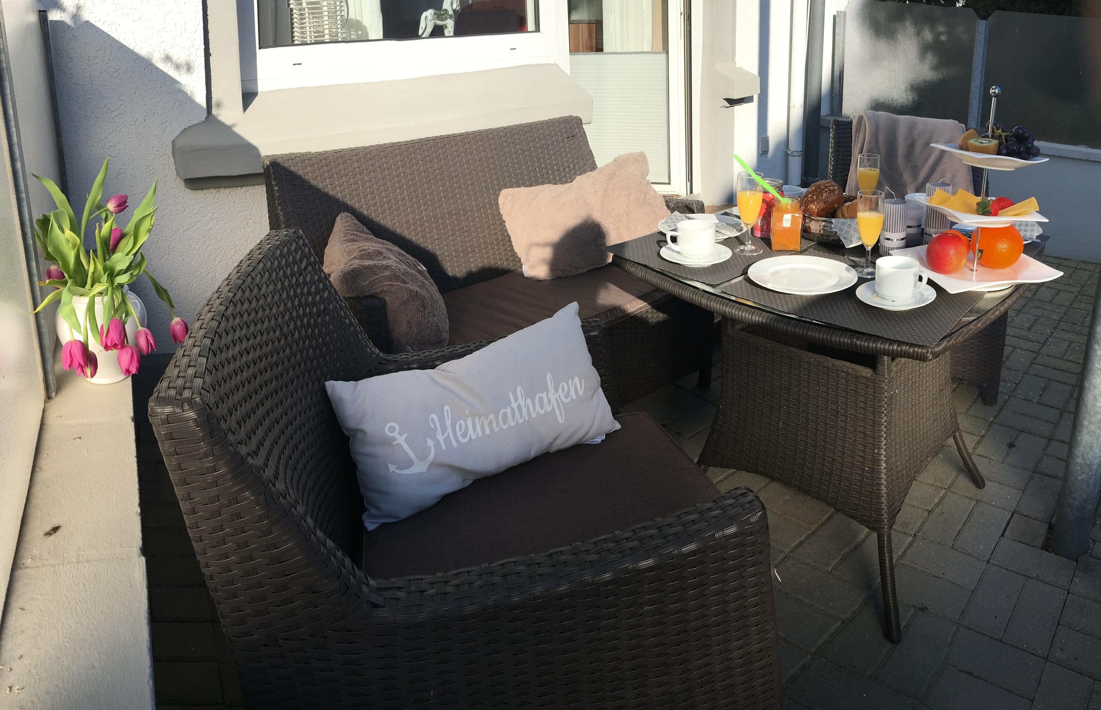 1 Terrasse mit modernen Möbeln / teilüberdacht