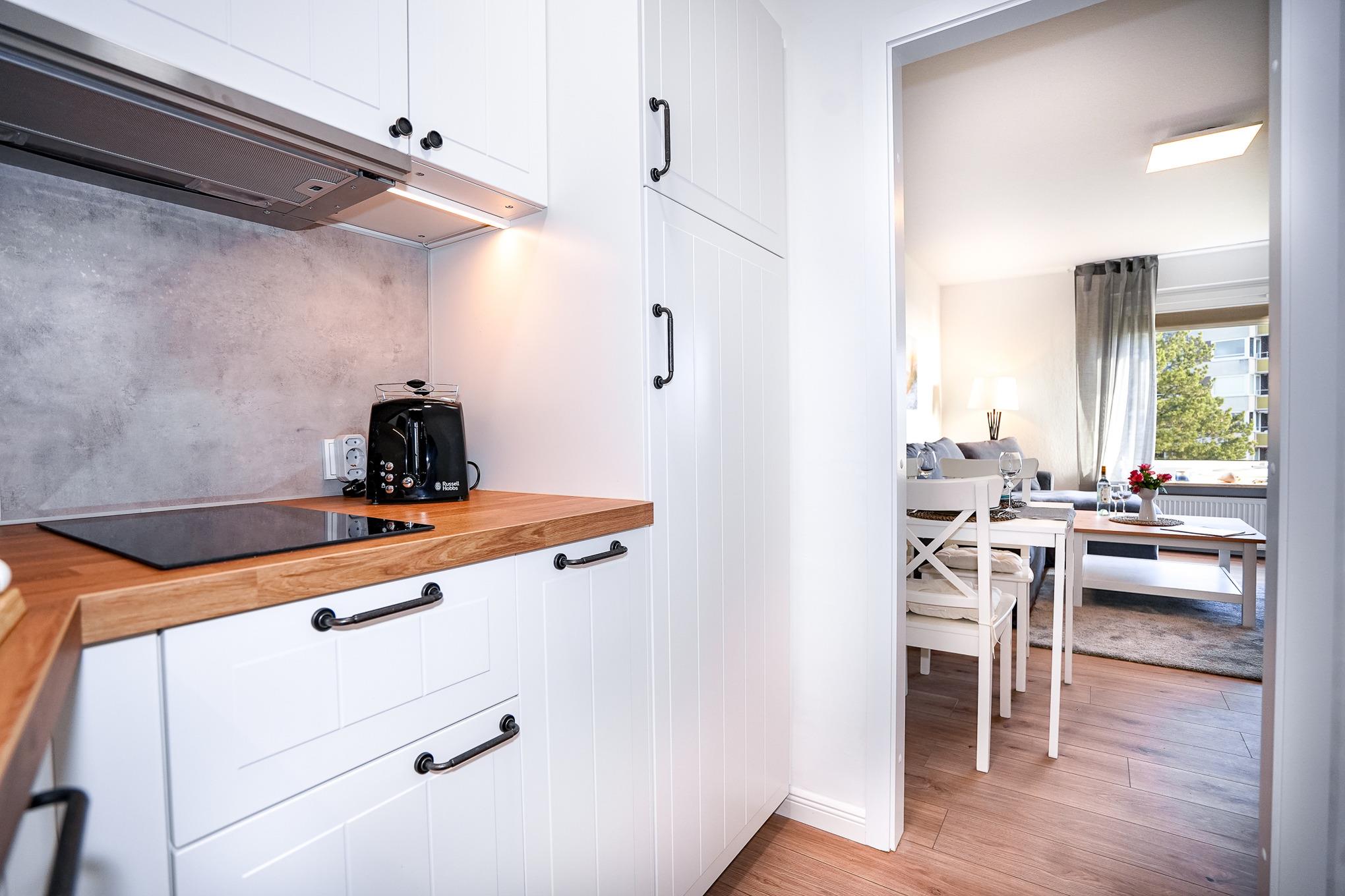 Die neue Küche bietet unter anderem eine Geschirrspülmaschine, ein 2-Felder-Cerankochfeld, Kühlschrank mit Gefrierfach, Mikrowelle und weitere kleine Küchenhelfer wie Kaffeemaschine, Wasserkocher und Toaster.