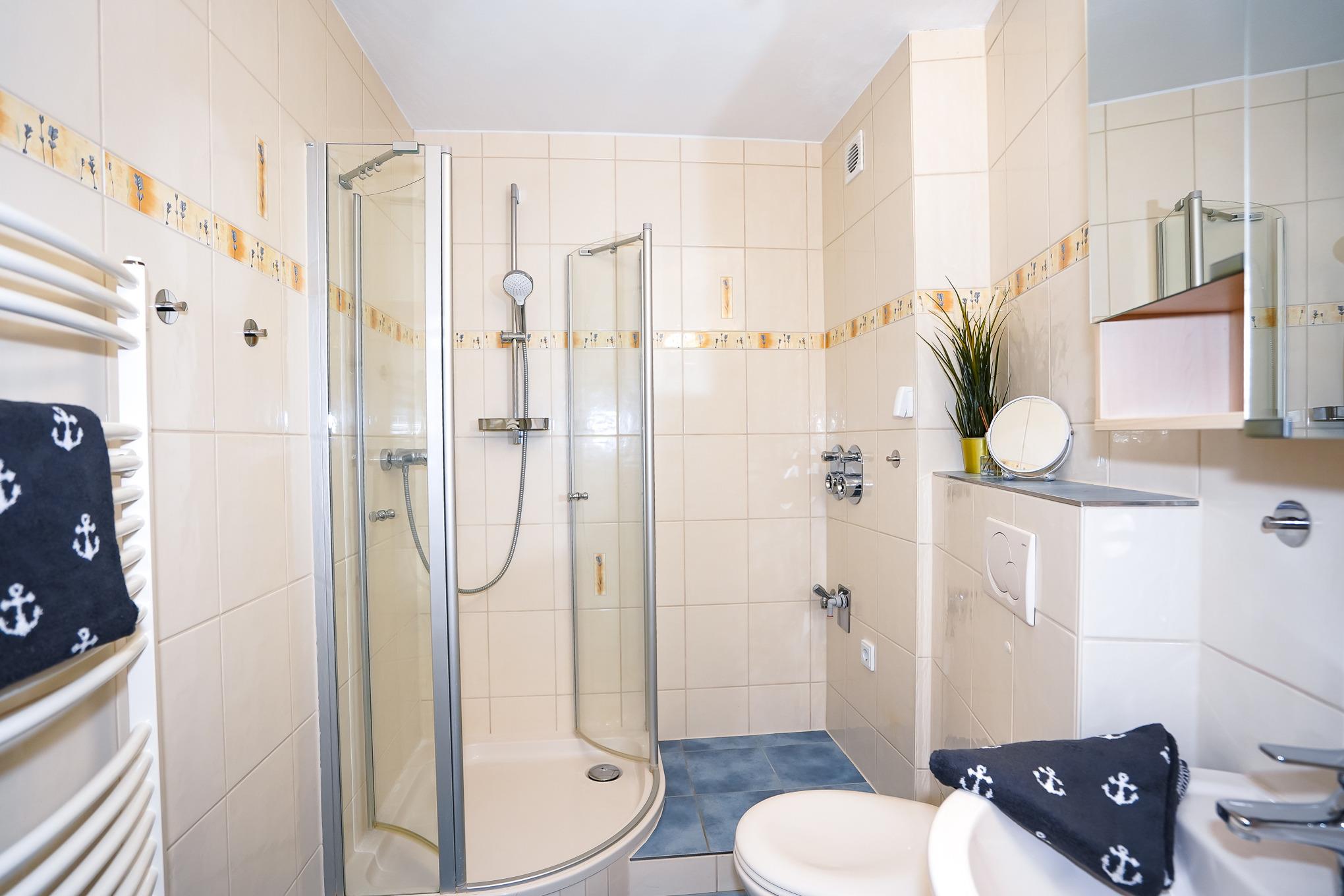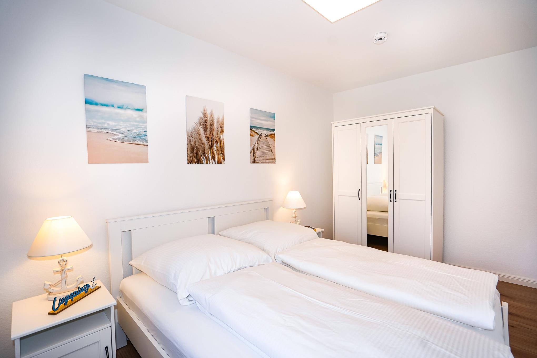 Das Schlafzimmer verfügt über ein Doppelbett mit hochwertigen Matratzen, sowie einen Kleiderschrank. Das freundliche Badezimmer in maritimer Optik ist mit einer Dusche, WC, Handtuchheizkörper und ausreichend Ablageflächen ausgestattet.