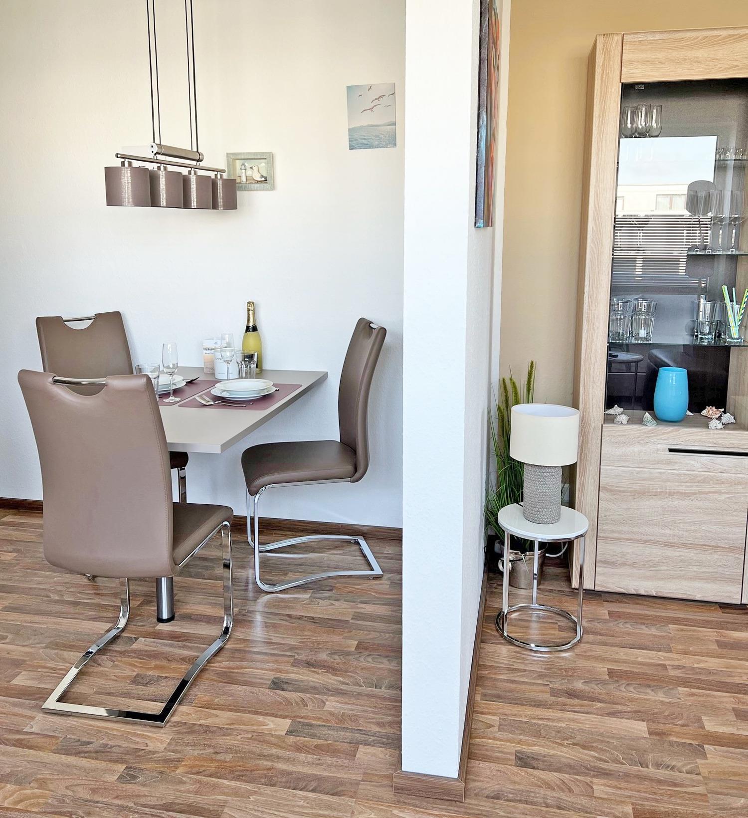 Es erwartet Sie ein helles Wohnzimmer mit einem großen und bequemen Ledersofa, einem Couchtisch und einem großen Fernseher sowie Schränke, einige Gesellschaftsspiele und Bücher stehen Ihnen zur Verfügung. Das große Fenster verfügt über eine Außenjalousie; Innenjalousien machen den Wohnraum gemütlich. Ein kleiner Balkon, ausreichend für 2 Personen, steht Ihnen zur Verfügung. Angrenzend an das Wohnzimmer befindet sich ein separater Essbereich.