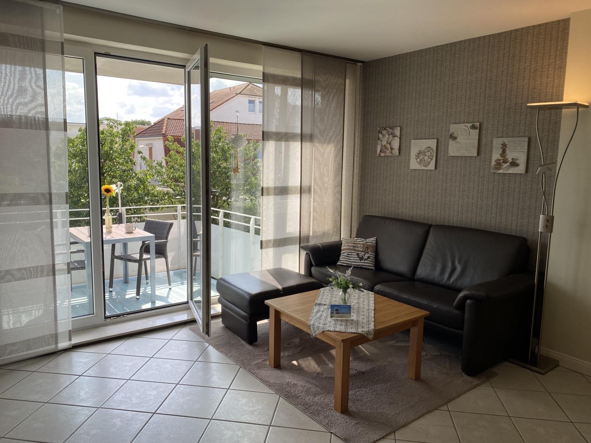 Das geschmackvolle, helle Wohnzimmer verfügt über eine moderne Couch-Garnitur mit einem Tisch, einen internetfähigen Fernseher (Smart-TV) und einen separaten Essplatz für bis zu 4 Personen. Es hat Zugang zum sonnigen, möblierten Süd-Balkon.