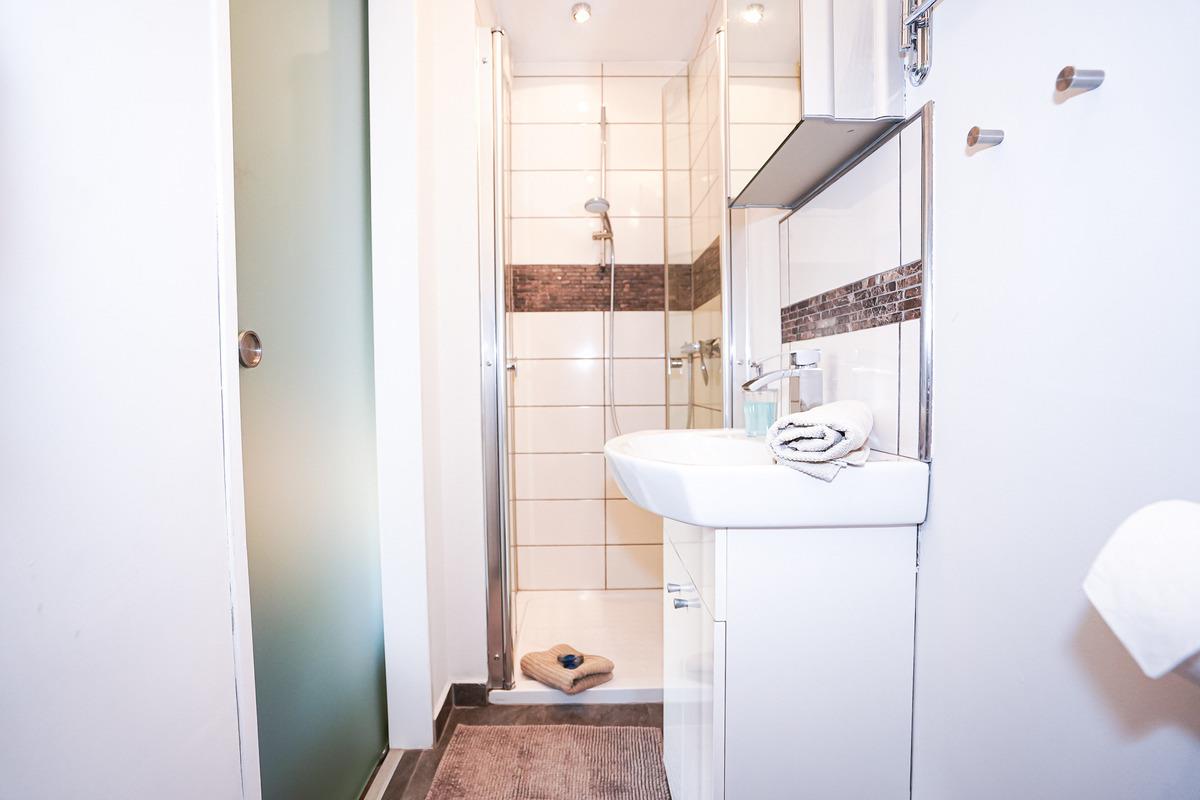 Die Wohnung "Strandmuschel" ist mit 96 qm die größte Einheit im Haus. Sie liegt im Erdgeschoß und besteht aus einem hellen, großzügigen Wohnzimmer mit Flachbild-TV, DVD-Player, Stereo-Anlage mit CD-Player, einer großen nicht einsehbaren Terrasse (ca. 36 qm), einem Essplatz für 6 Personen, einer modernen Marken-Einbauküche u. a. mit Cerankochfeld, Backofen, Kühl- Gefrierkombination, Geschirrspüler, Mikrowelle, Kaffeemaschine, Wasserkocher usw. Die Komfort-Wohnung verfügt über zwei Schlafzimmer mit hochwertigen Doppelbetten sowie einem Kinderzimmer mit Etagenbetten (90 x 2 m). Eines der Schlafzimmer verfügt über ein Master-Duschbad. Ein weiteres großes Duschbad mit Tageslicht steht ebenfalls zur Verfügung.