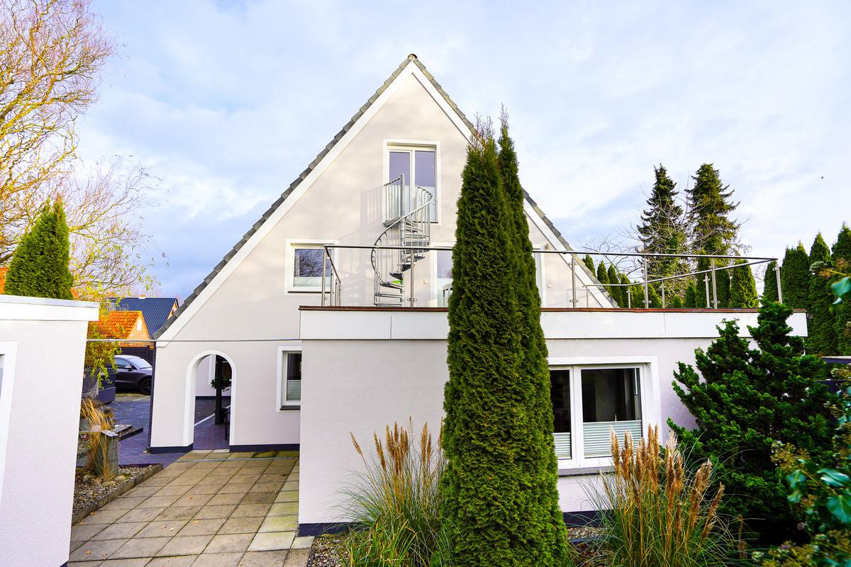 Moderne Ferienwohnung in Grömitz mit Sauna, großer Terrasse und Garten hinter einem Obstgarten.