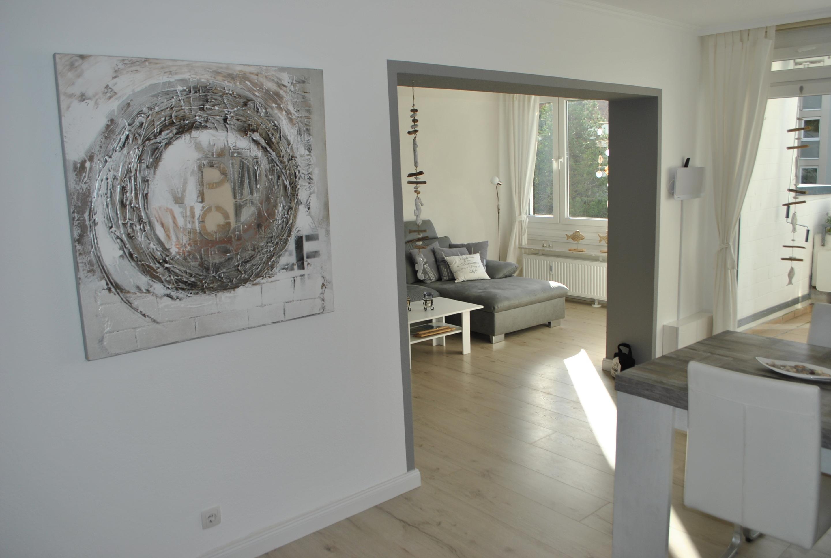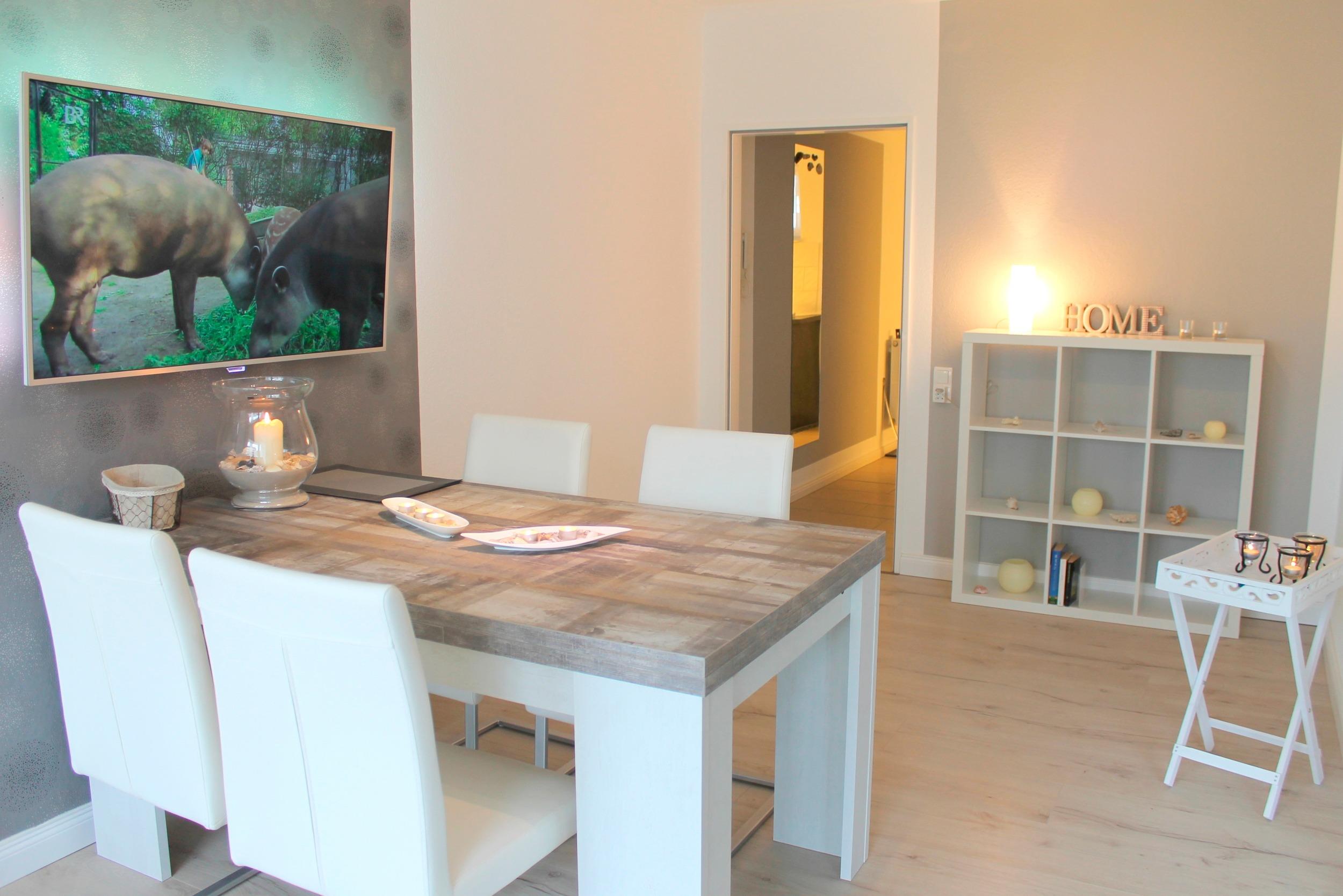 Bei der hell, modern und hochwertig eingerichteten Wohnung haben wir darauf geachtet, dass es Ihnen an nichts fehlt. Im dem großen und hellen Wohnzimmer mit einem sehr komfortablen Ess- sowie auch Wohnbereich können Sie entspannen und zur Ruhe kommen. In dem Wohnbereich befindet sich ein großer LED Flachbildfernseher.