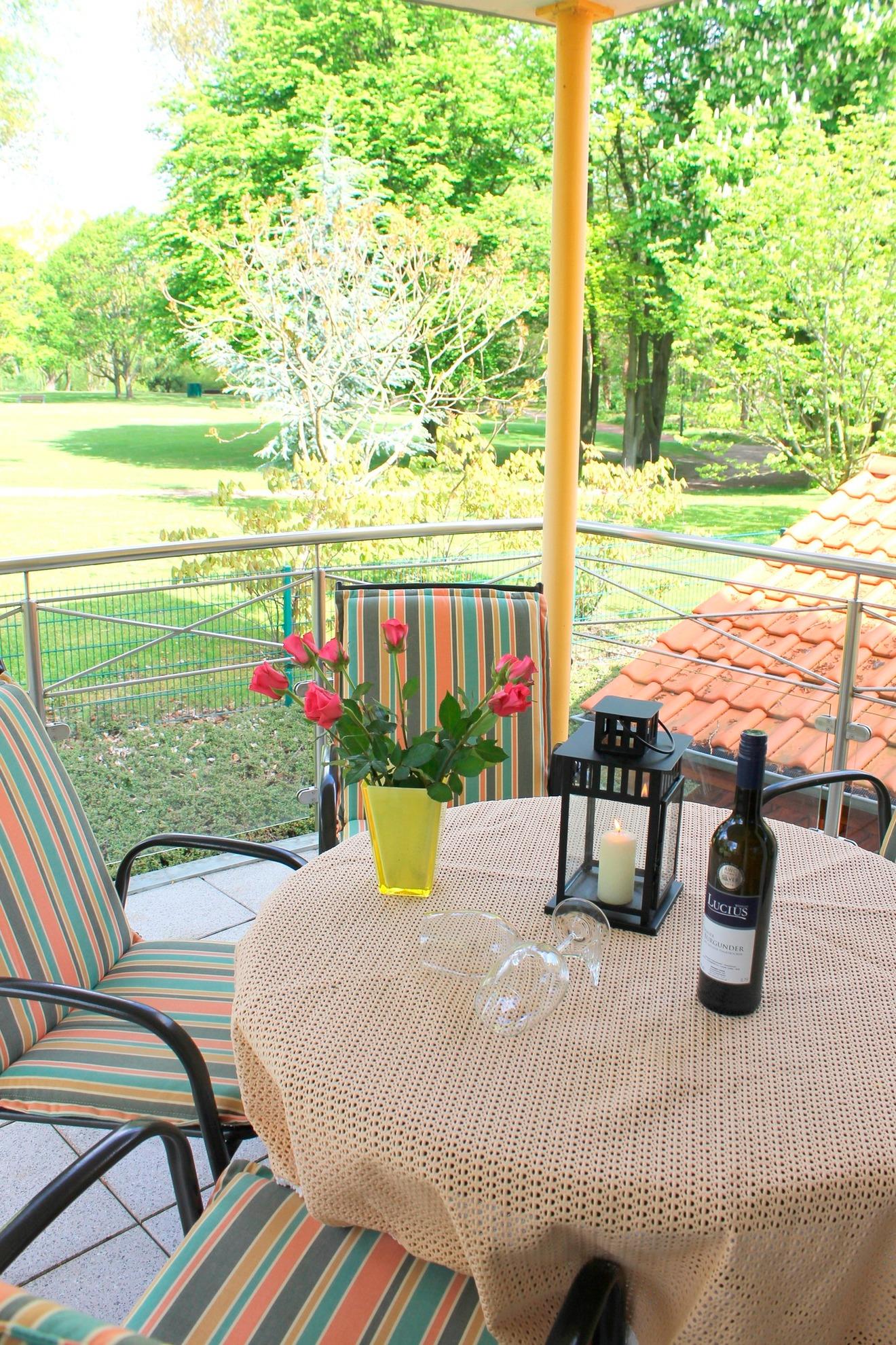 Moderne Ferienwohnung mit Balkon und Blick auf den Kurpark in Grömitz, nur 5 Minuten vom Strand entfernt.