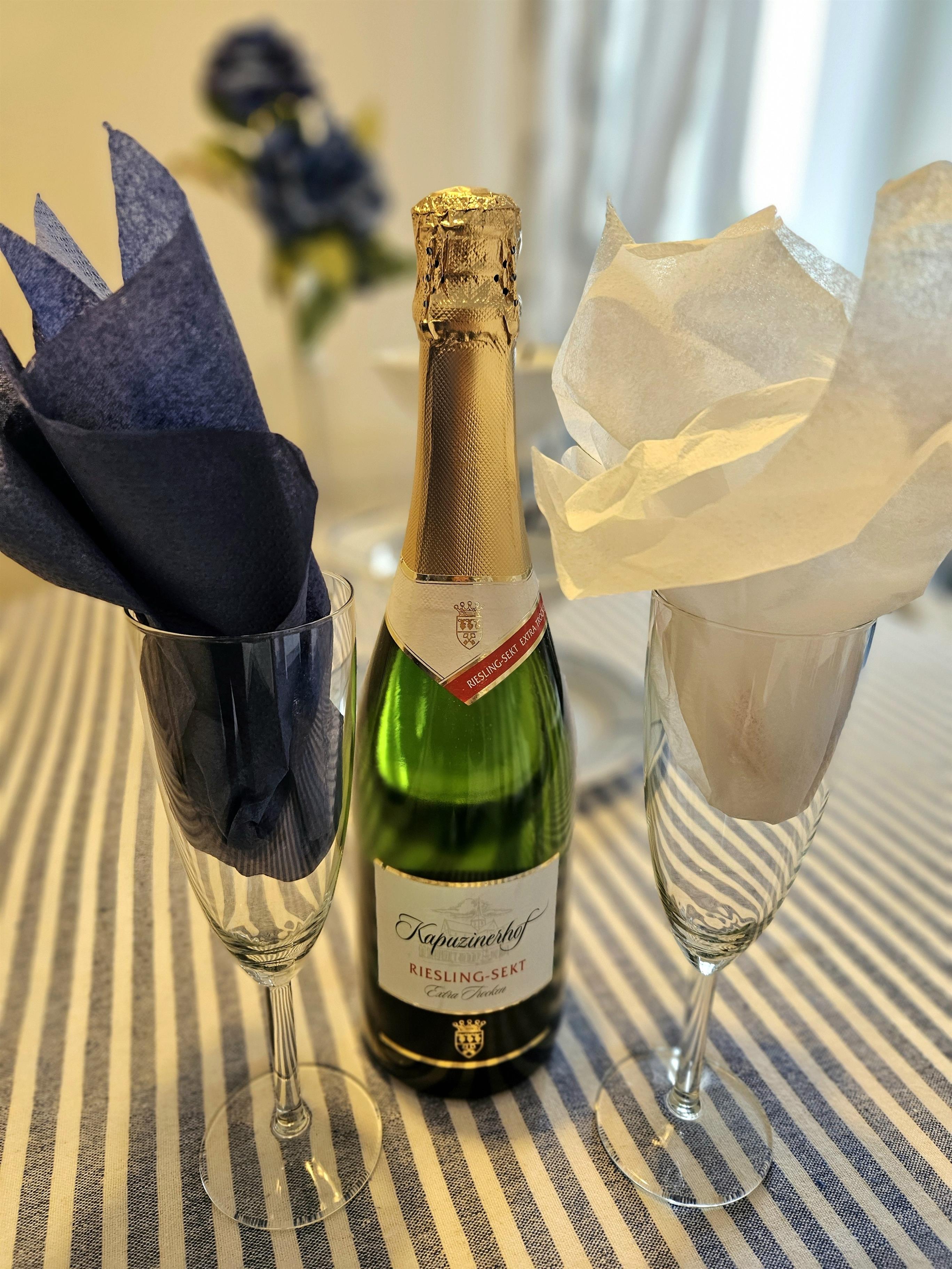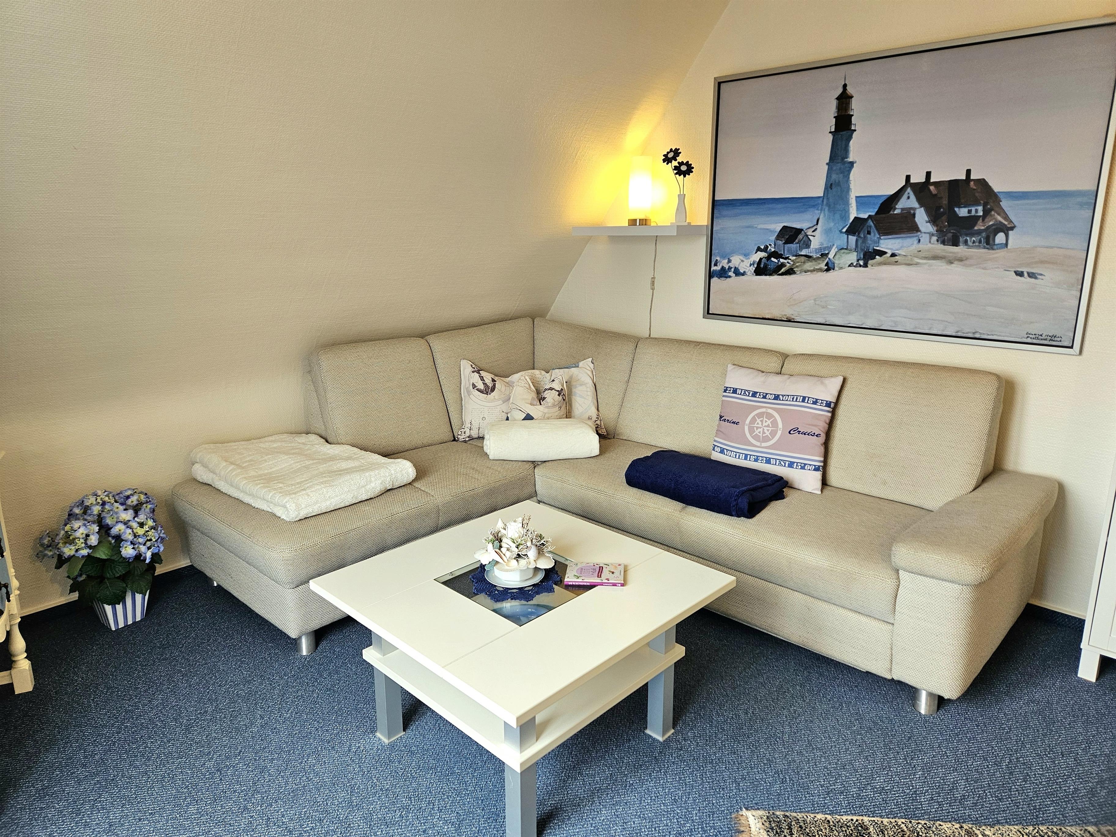 Unsere blau-weiße 3 Sterne Ferienwohnung für 1 - 3 Personen. Sie besteht aus einem Flur, Schlafzimmer mit Doppelbett, Wohnzimmer, Essecke, Küche, neuem Duschbad und Balkon.