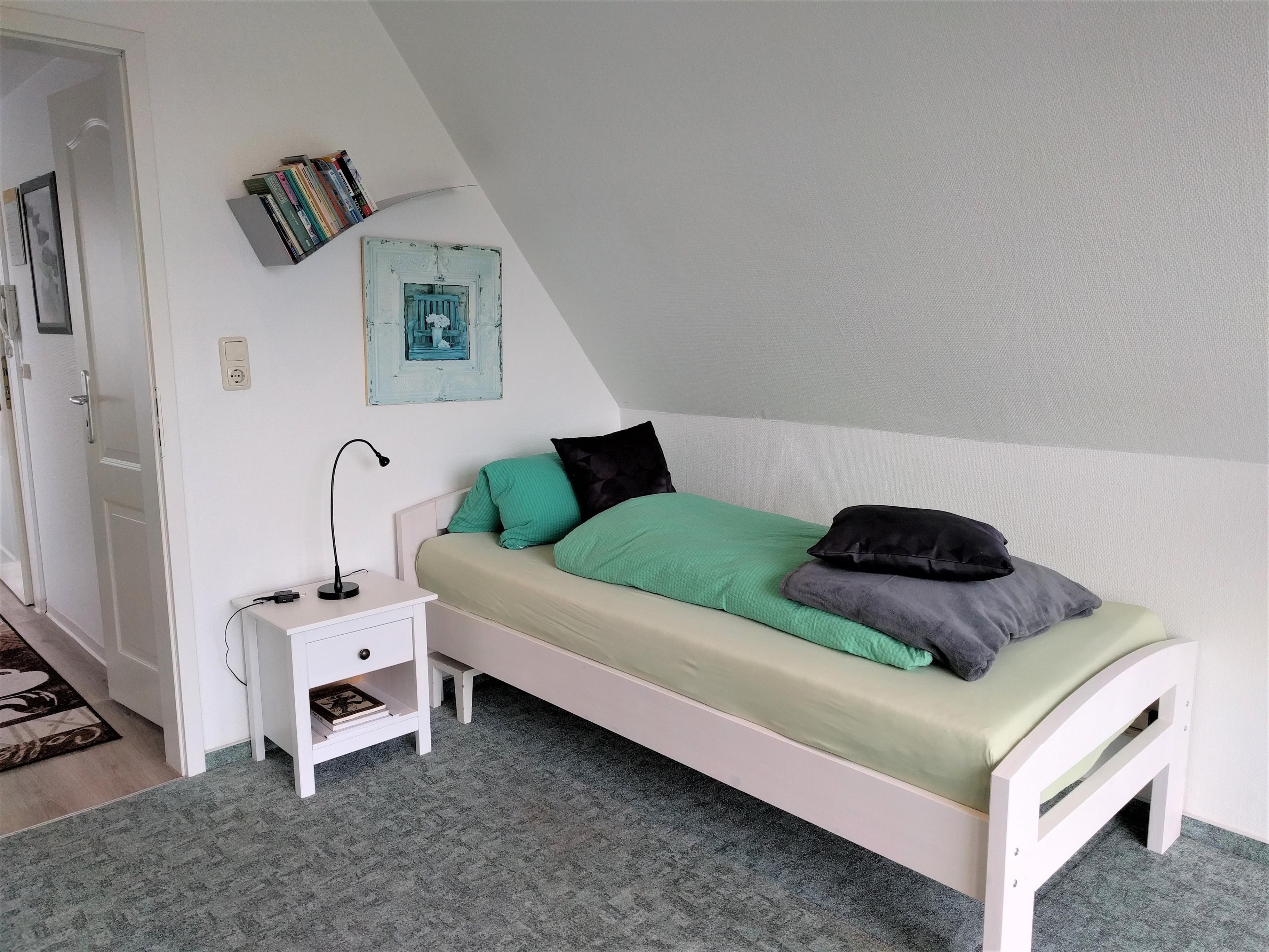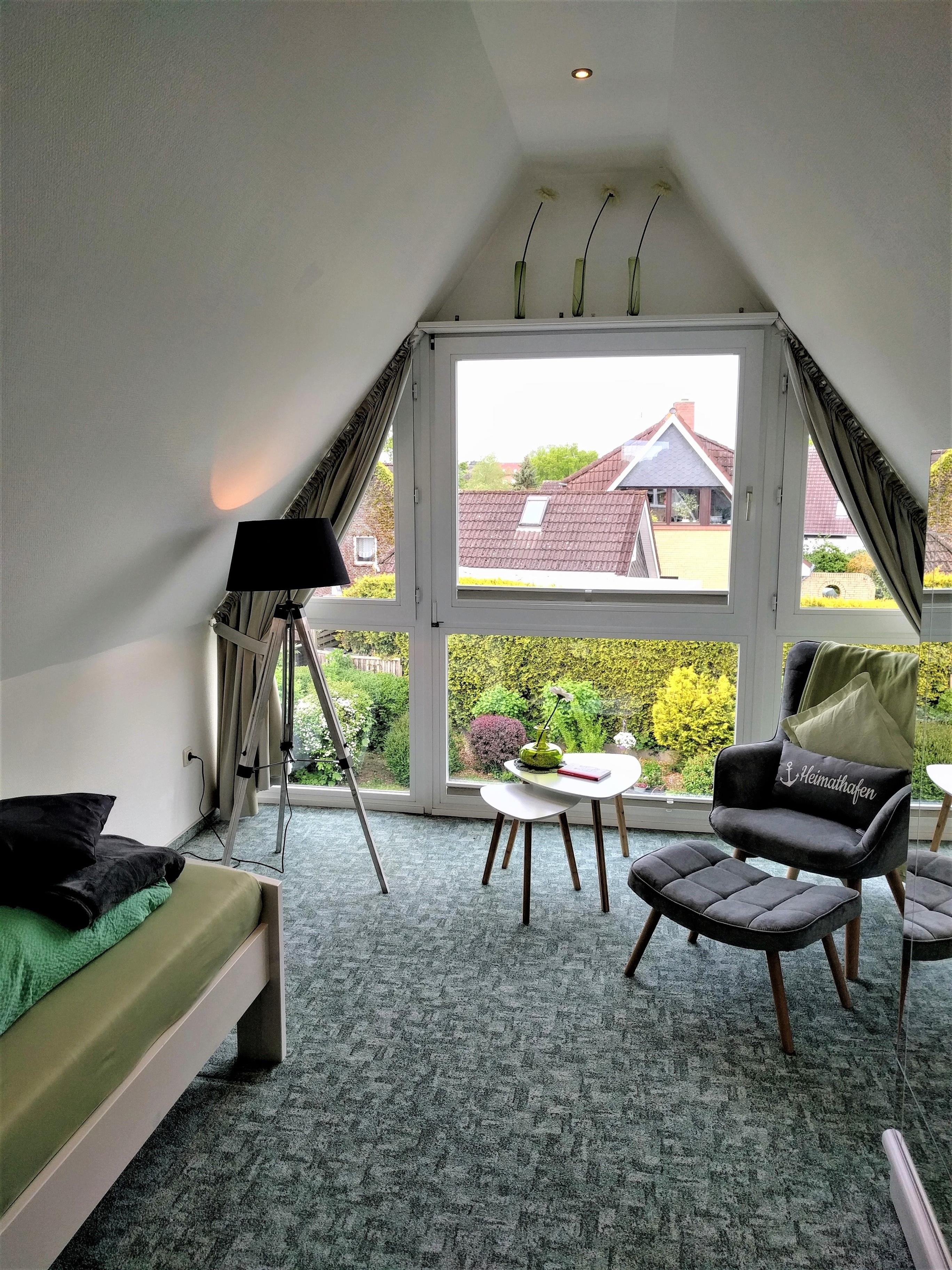 Unser grünes 3-Sterne Dachstudio für 1 - 2 Personen mit Blick über den Grömitzer Golfplatz. Das Apartment besteht aus einem großen Wohn-Schlafzimmer mit Sitzecke, Essplatz und Doppelbett, einem extra Schlafzimmer mit Blick über Grömitz sowie Küche und neuem Duschbad.