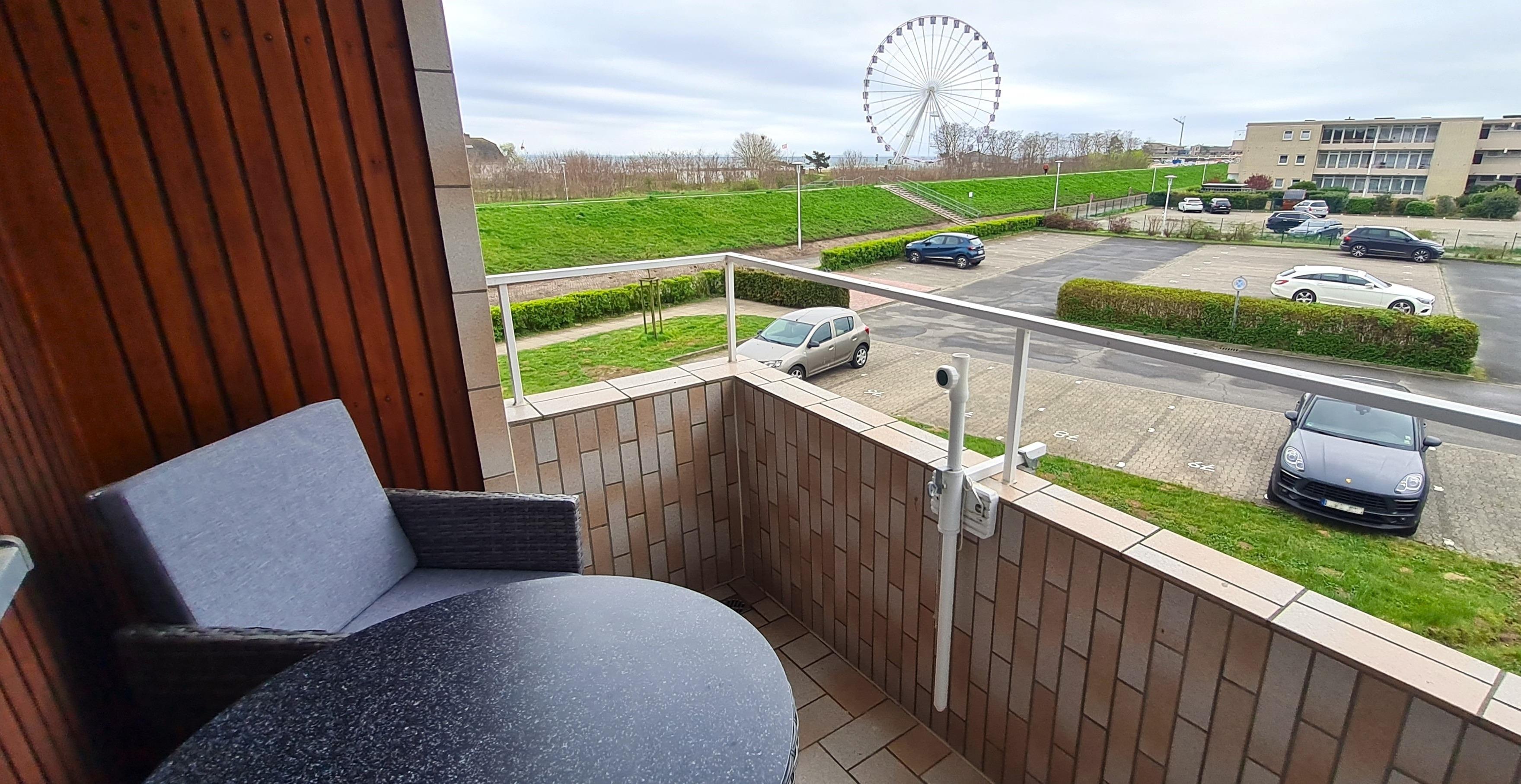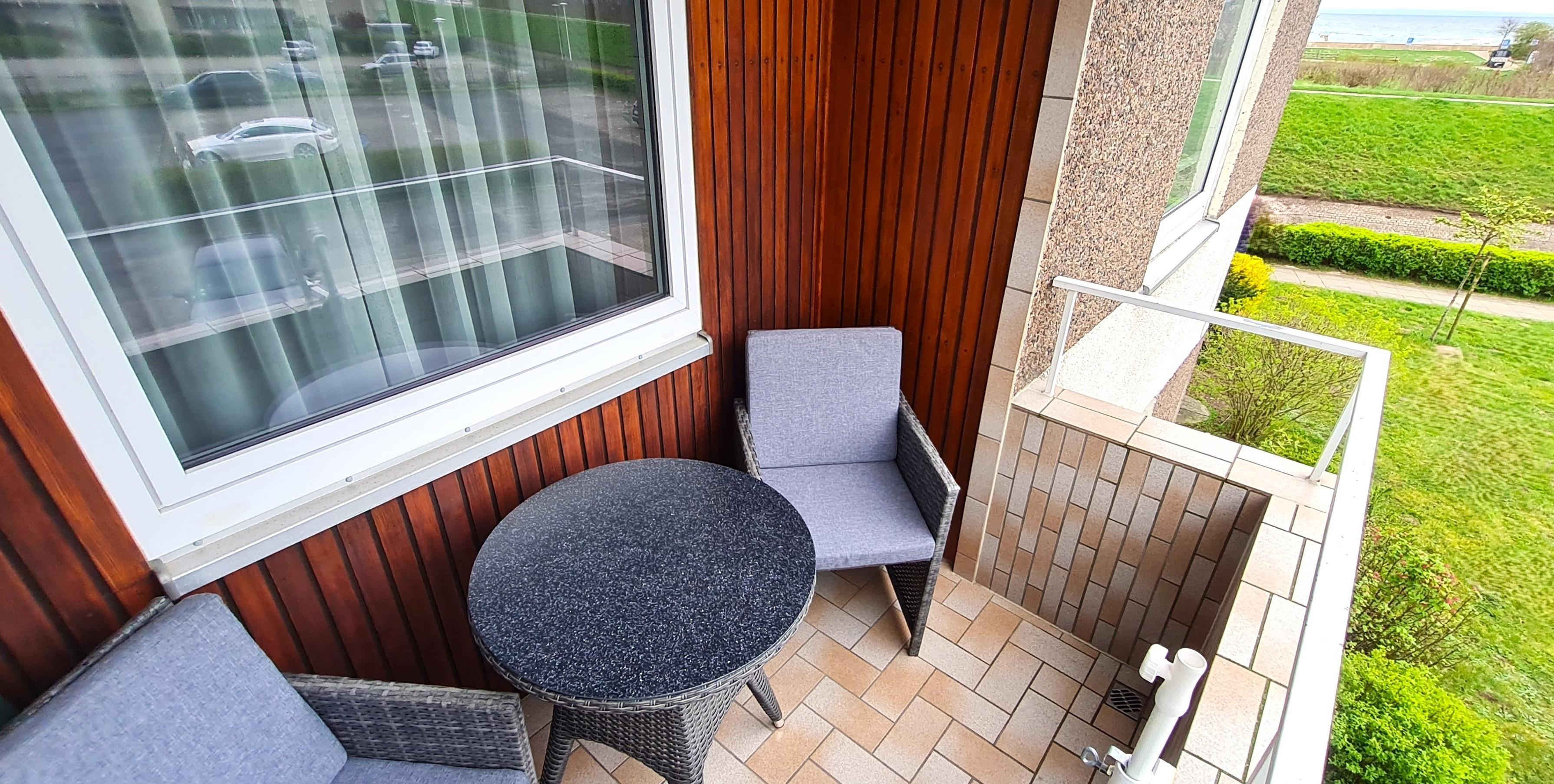 Der großzügige Wohnbereich bietet Zugang zum Süd-/Westbalkon, von dem aus Sie ebenfalls einen tollen Blick auf die Ostsee und den Dünenpark haben. Wenn Sie die frische Luft genießen möchten, finden Sie auf dem Balkon Balkonmöbel vor. Lehnen Sie sich zurück, genießen Sie den Ausblick und entspannen Sie sich auf den bequemen Stühlen.