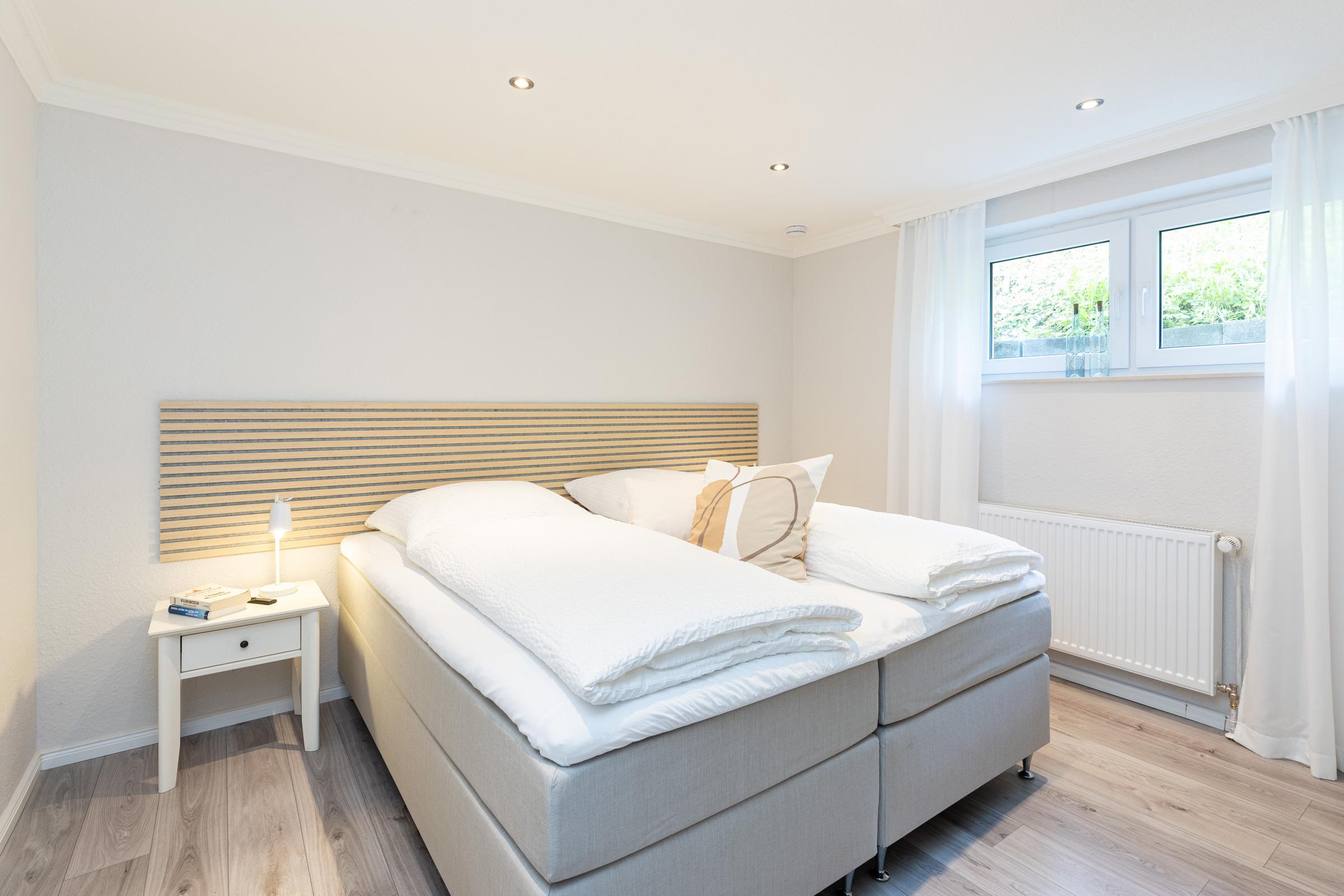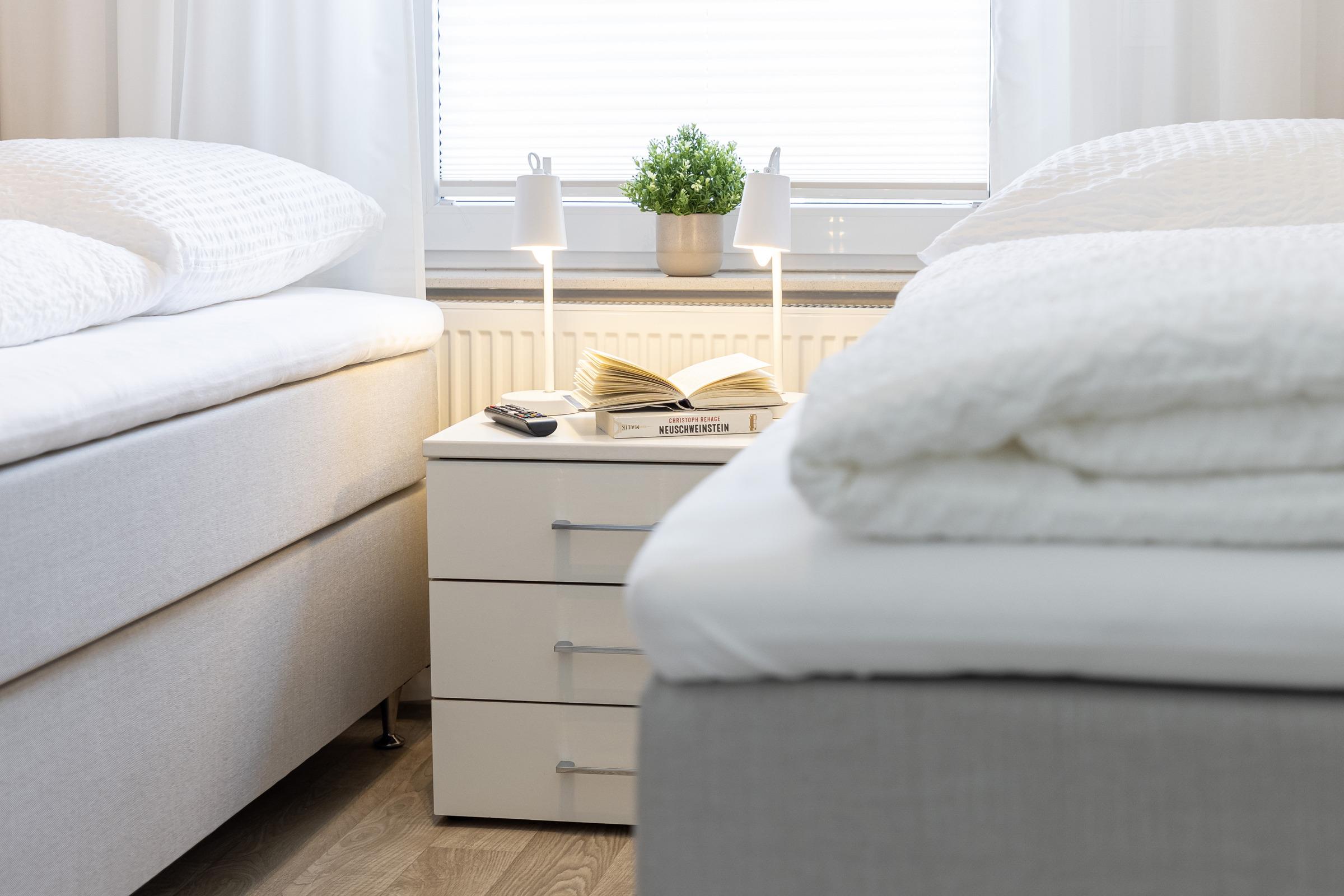 - Zwei Schlafräume mit Boxspring-Betten: ein Doppelbett (180x200) und zwei Einzelbetten (90x200)
