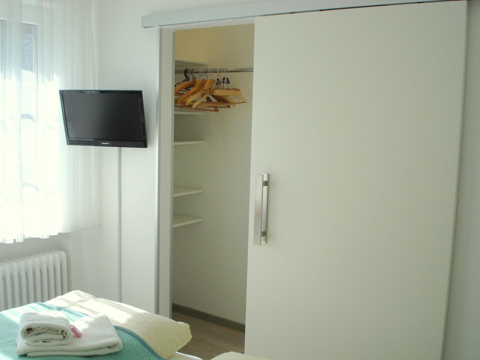 Das Schlafzimmer ist möbliert mit einem komfortables Boxspring-Bett (1,80m x 2,00m), Fernseher und einem Schrank.