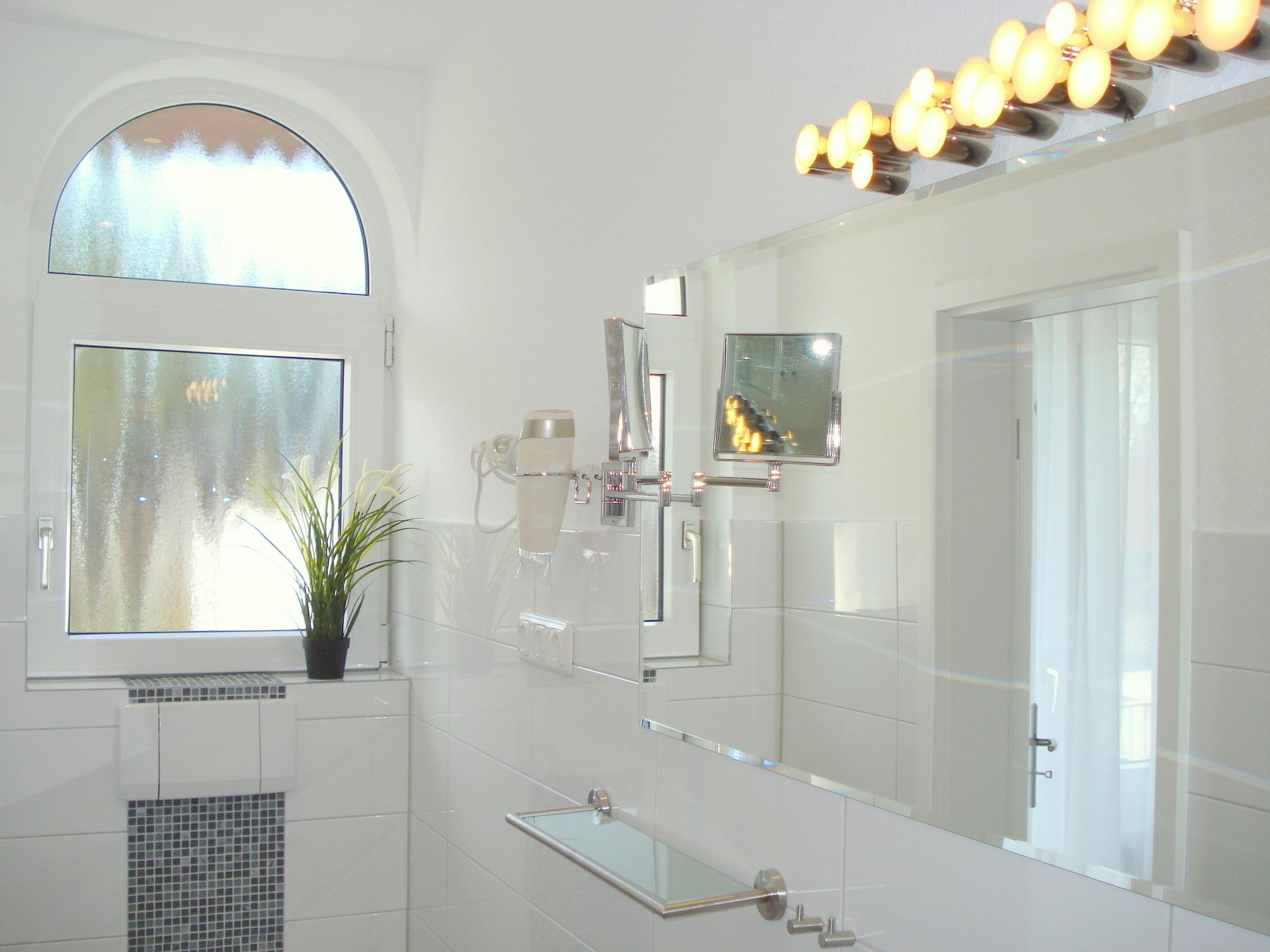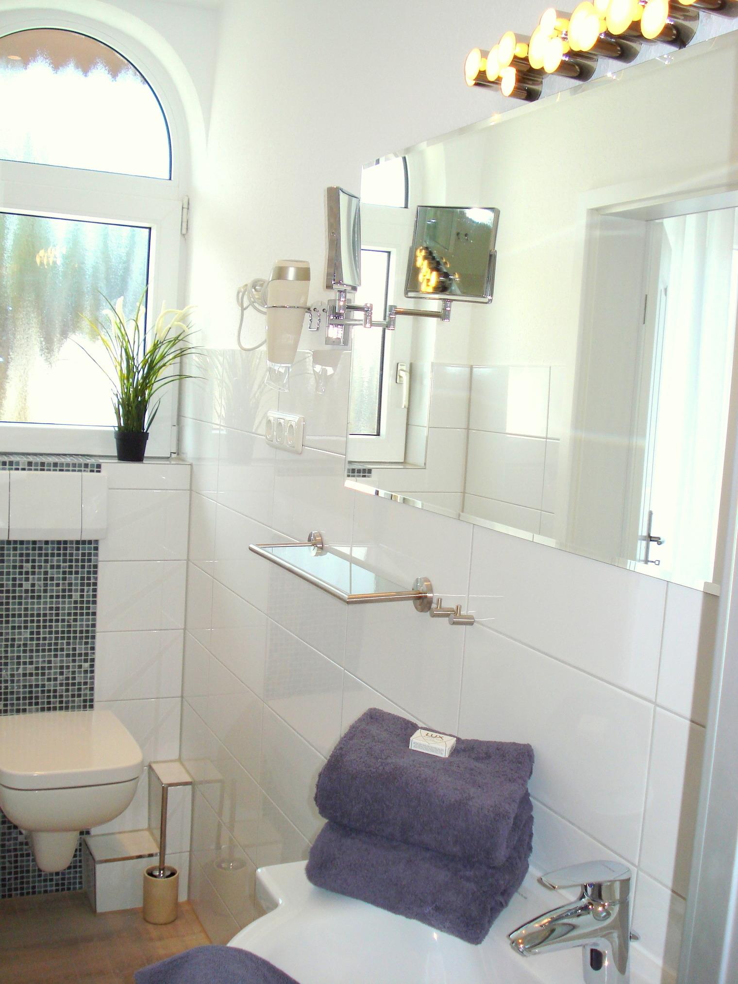 Das hellgeflieste Bad ist mit Duschkabine, WC & Waschbecken ausgestattet.