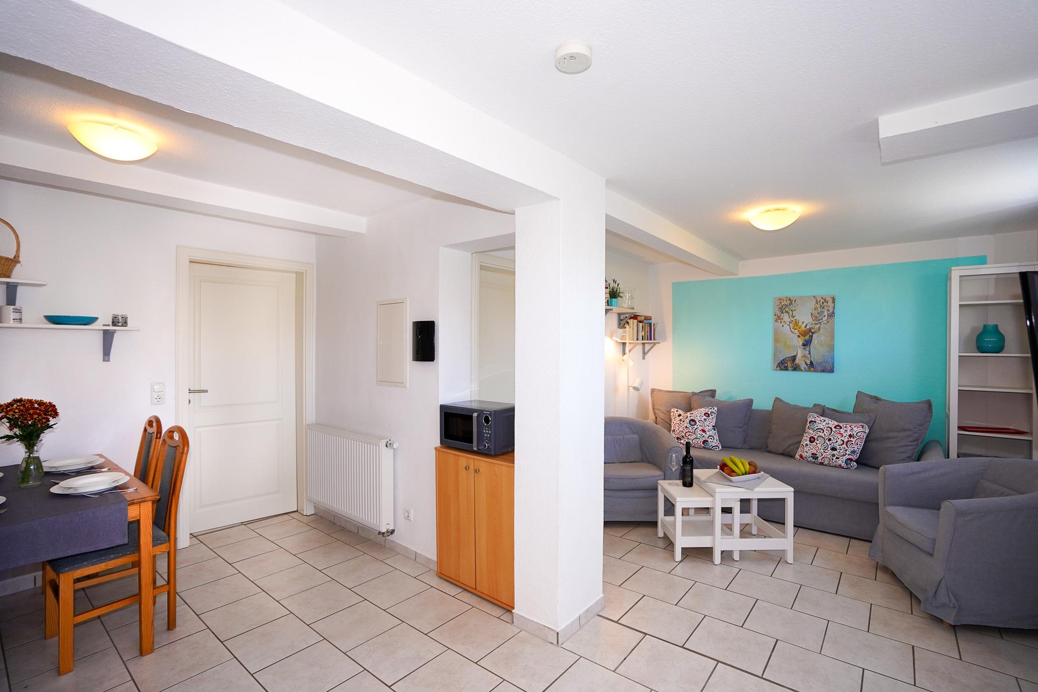 Die modern ausgestattete Wohnung mit einer Größe von ca. 42 qm ist für bis zu 4 Personen eingerichtet. Im Wohnzimmer mit SAT-TV befinden sich eine Schlafcouch, zwei gemütliche Sessel, sowie ein Esstisch mit Stühlen. In der Küchenzeile finden Sie neben Backofen und den üblichen Elektrogeräten auch eine Spülmaschine und eine Mikrowelle vor. Neben dem Schlafzimmer mit Doppelbett und Kleiderschrank steht Ihnen ein barrierefreies Duschbad mit WC zur Verfügung.
